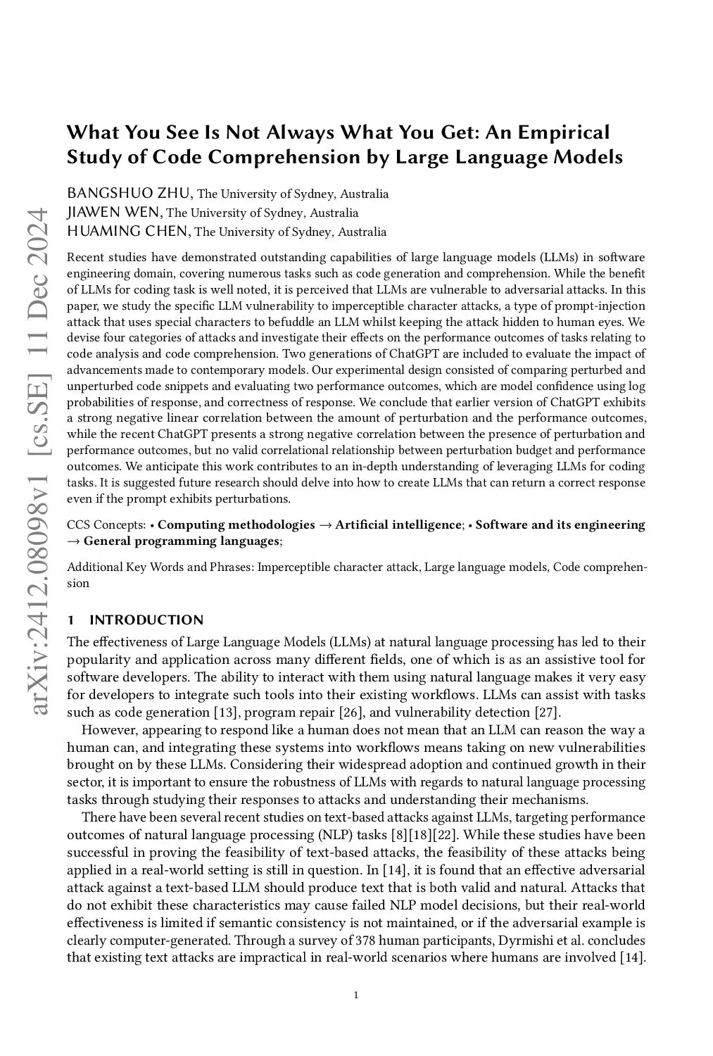 Recent studies have demonstrated outstanding capabilities of large language models (LLMs) in software engineering tasks, including code generation and comprehension. While LLMs have shown significant potential in assisting with coding, LLMs are vulnerable to adversarial attacks. In this paper, we investigate the vulnerability of LLMs to imperceptible attacks. This class of attacks manipulate source code at the character level, which renders the changes invisible to human reviewers yet effective in misleading LLMs' behaviour. We devise these attacks into four distinct categories and analyse their impacts on code analysis and comprehension tasks. These four types of imperceptible character attacks include coding reordering, invisible coding characters, code deletions, and code homoglyphs. To assess the robustness of state-of-the-art LLMs, we present a systematic evaluation across multiple models using both perturbed and clean code snippets. Two evaluation metrics, model confidence using log probabilities of response and response correctness, are introduced. The results reveal that LLMs are susceptible to imperceptible coding perturbations, with varying degrees of degradation highlighted across different LLMs. Furthermore, we observe a consistent negative correlation between perturbation magnitude and model performance. These results highlight the urgent need for robust LLMs capable of manoeuvring behaviours under imperceptible adversarial conditions.