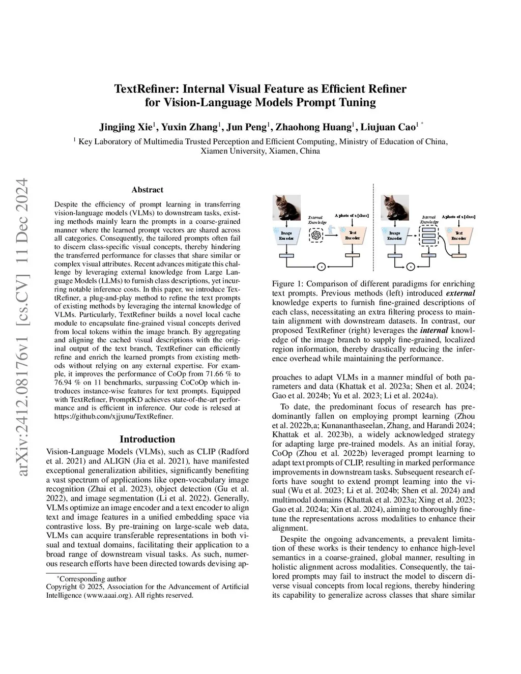 Despite the efficiency of prompt learning in transferring vision-language models (VLMs) to downstream tasks, existing methods mainly learn the prompts in a coarse-grained manner where the learned prompt vectors are shared across all categories. Consequently, the tailored prompts often fail to discern class-specific visual concepts, thereby hindering the transferred performance for classes that share similar or complex visual attributes. Recent advances mitigate this challenge by leveraging external knowledge from Large Language Models (LLMs) to furnish class descriptions, yet incurring notable inference costs. In this paper, we introduce TextRefiner, a plug-and-play method to refine the text prompts of existing methods by leveraging the internal knowledge of VLMs. Particularly, TextRefiner builds a novel local cache module to encapsulate fine-grained visual concepts derivedfrom local tokens within the image branch. By aggregating and aligning the cached visual descriptions with the original output of the text branch, TextRefiner can efficiently refine and enrich the learned prompts from existing methods without relying on any external expertise. For example, it improves the performance of CoOp from 71.66 % to 76.94 % on 11 benchmarks, surpassing CoCoOp which introduces instance-wise features for text prompts. Equipped with TextRefiner, PromptKD achieves state-of-the-art performance and is efficient in inference. Our code is relesed at https://github.com/xjjxmu/TextRefiner