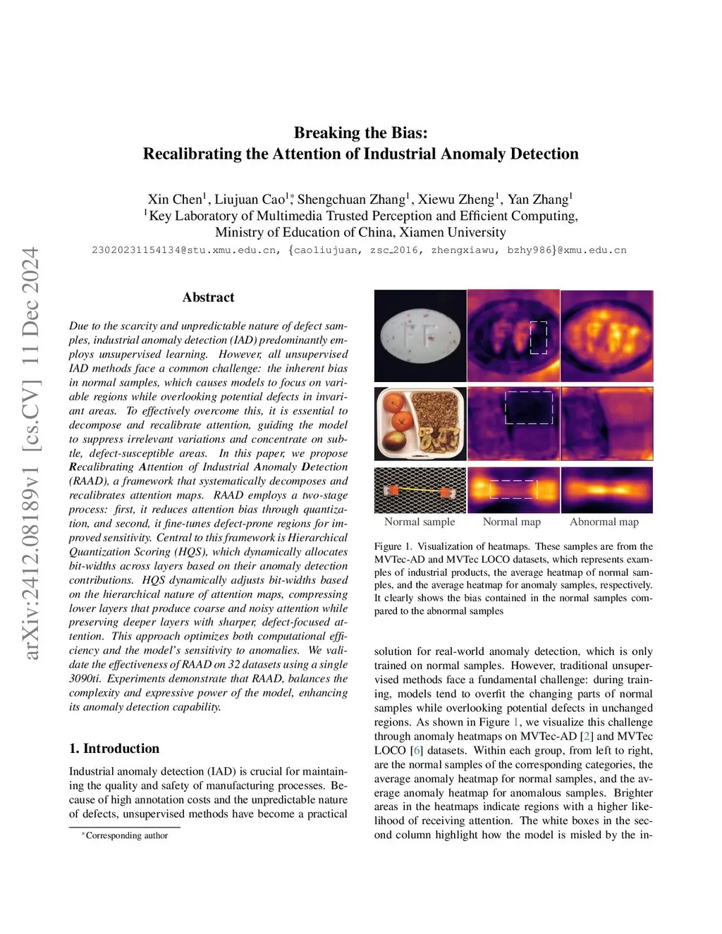 Due to the scarcity and unpredictable nature of defect samples, industrial anomaly detection (IAD) predominantly employs unsupervised learning. However, all unsupervised IAD methods face a common challenge: the inherent bias in normal samples, which causes models to focus on variable regions while overlooking potential defects in invariant areas. To effectively overcome this, it is essential to decompose and recalibrate attention, guiding the model to suppress irrelevant variations and concentrate on subtle, defect-susceptible areas. In this paper, we propose Recalibrating Attention of Industrial Anomaly Detection (RAAD), a framework that systematically decomposes and recalibrates attention maps. RAAD employs a two-stage process: first, it reduces attention bias through quantization, and second, it fine-tunes defect-prone regions for improved sensitivity. Central to this framework is Hierarchical Quantization Scoring (HQS), which dynamically allocates bit-widths across layers based on their anomaly detection contributions. HQS dynamically adjusts bit-widths based on the hierarchical nature of attention maps, compressing lower layers that produce coarse and noisy attention while preserving deeper layers with sharper, defect-focused attention. This approach optimizes both computational efficiency and the model' s sensitivity to anomalies. We validate the effectiveness of RAAD on 32 datasets using a single 3090ti. Experiments demonstrate that RAAD, balances the complexity and expressive power of the model, enhancing its anomaly detection capability.