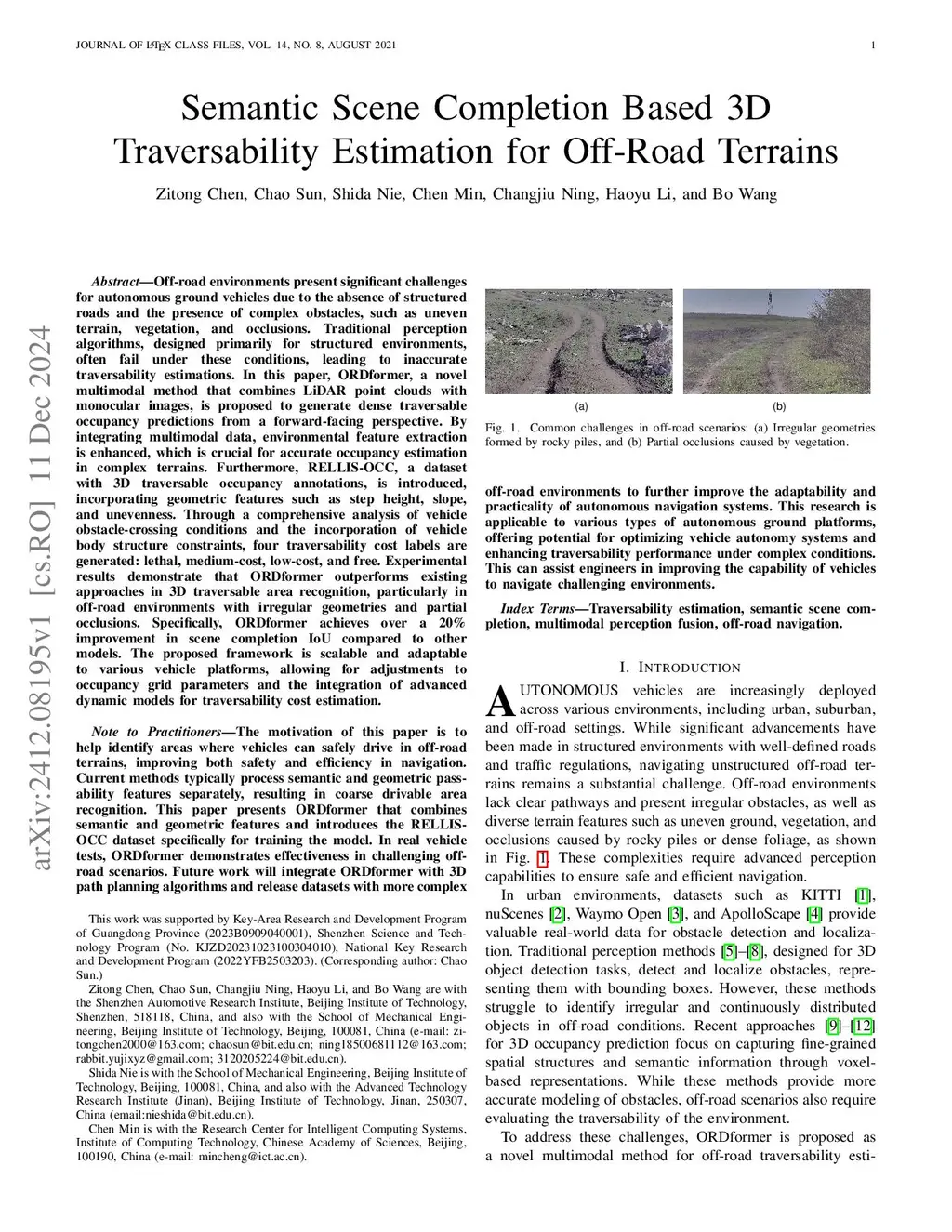 Off-road environments remain significant challenges for autonomous ground vehicles, due to the lack of structured roads and the presence of complex obstacles, such as uneven terrain, vegetation, and occlusions. Traditional perception algorithms, primarily designed for structured environments, often fail in unstructured scenarios. In this paper, traversable area recognition is achieved through semantic scene completion. A novel multimodal method, 3DTTNet, is proposed to generate dense traversable terrain estimations by integrating LiDAR point clouds with monocular images from a forward-facing perspective. By integrating multimodal data, environmental feature extraction is strengthened, which is crucial for accurate terrain modeling in complex terrains. Furthermore, RELLIS-OCC, a dataset with 3D traversable annotations, is introduced, incorporating geometric features such as step height, slope, and unevenness. Through a comprehensive analysis of vehicle obsta cle-crossing conditions and the incorporation of vehicle body structure constraints, four traversability cost labels are generated: lethal, medium-cost, low-cost, and free. Experimental results demonstrate that 3DTTNet outperforms the comparison approaches in 3D traversable area recognition, particularly in off-road environments with irregular geometries and partial occlusions. Specifically, 3DTTNet achieves a 42\% improvement in scene completion IoU compared to other models. The proposed framework is scalable and adaptable to various vehicle platforms, allowing for adjustments to occupancy grid parameters and the integration of advanced dynamic models for traversability cost estimation.