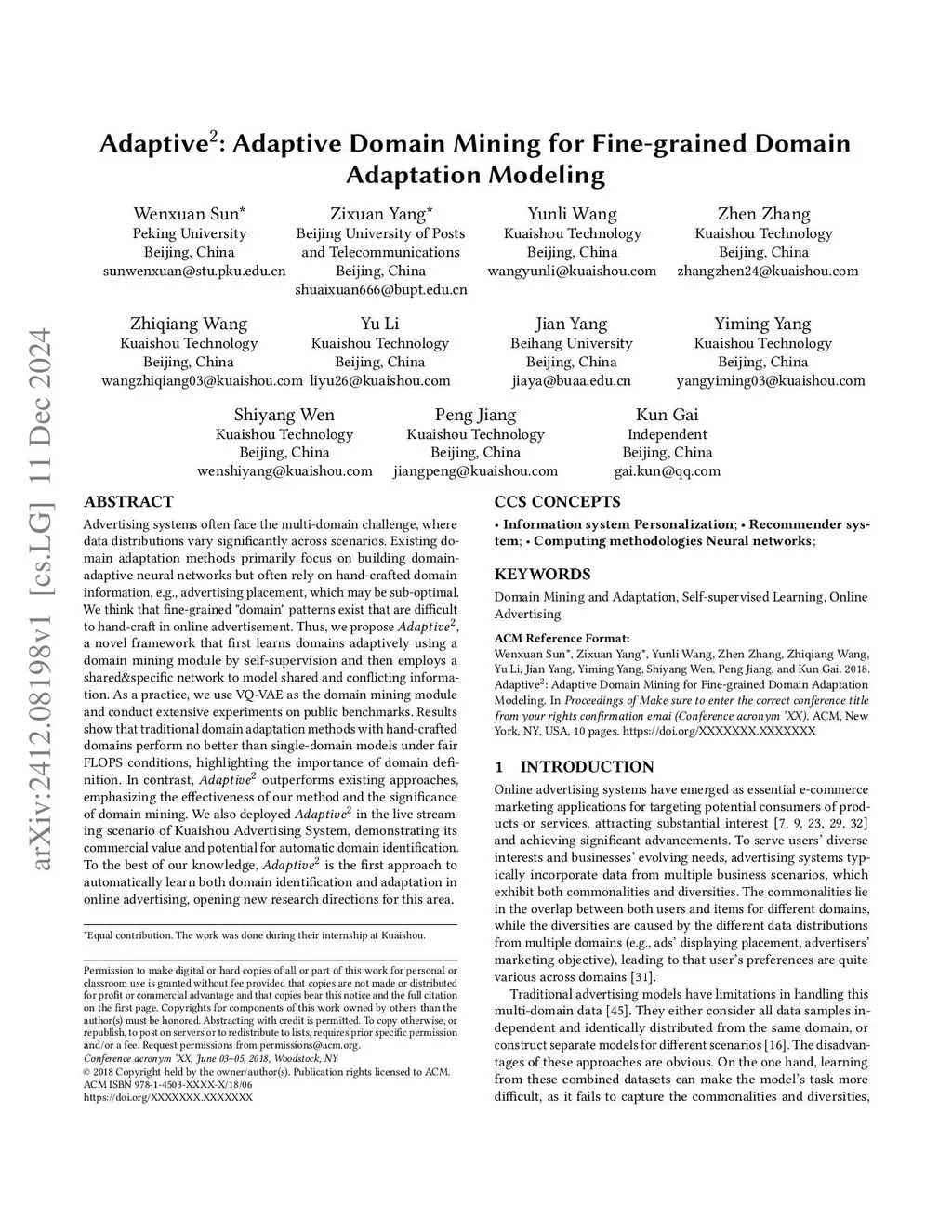 Advertising systems often face the multi-domain challenge, where data distributions vary significantly across scenarios. Existing domain adaptation methods primarily focus on building domain-adaptive neural networks but often rely on hand-crafted domain information, e.g., advertising placement, which may be sub-optimal. We think that fine-grained "domain" patterns exist that are difficult to hand-craft in online advertisement. Thus, we propose Adaptive, a novel framework that first learns domains adaptively using a domain mining module by self-supervision and then employs a shared&specific network to model shared and conflicting information. As a practice, we use VQ-VAE as the domain mining module and conduct extensive experiments on public benchmarks. Results show that traditional domain adaptation methods with hand-crafted domains perform no better than single-domain models under fair FLOPS conditions, highlighting the importance of domain definition. In contrast, Adaptive outperforms existing approaches, emphasizing the effectiveness of our method and the significance of domain mining. We also deployed Adaptive in the live streaming scenario of Kuaishou Advertising System, demonstrating its commercial value and potential for automatic domain identification. To the best of our knowledge, Adaptive is the first approach to automatically learn both domain identification and adaptation in online advertising, opening new research directions for this area.