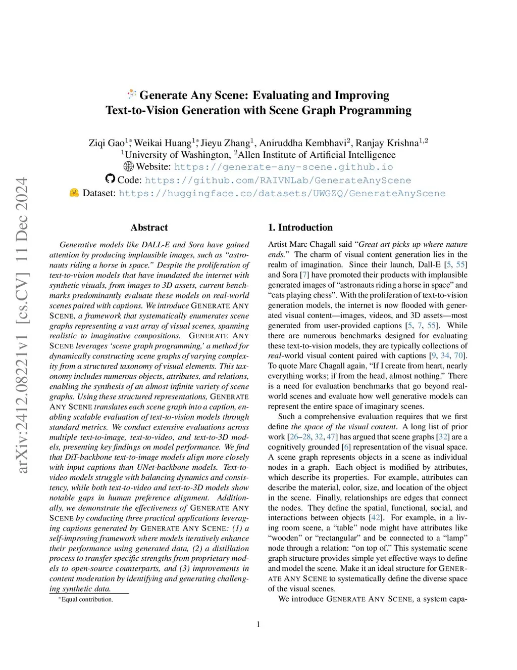 Recent advances in text-to-vision generation excel in visual fidelity but struggle with compositional generalization and semantic alignment. Existing datasets are noisy and weakly compositional, limiting models' understanding of complex scenes, while scalable solutions for dense, high-quality annotations remain a challenge. We introduce Generate Any Scene, a data engine that systematically enumerates scene graphs representing the combinatorial array of possible visual scenes. Generate Any Scene dynamically constructs scene graphs of varying complexity from a structured taxonomy of objects, attributes, and relations. Given a sampled scene graph, Generate Any Scene translates it into a caption for text-to-image or text-to-video generation; it also translates it into a set of visual question answers that allow automatic evaluation and reward modeling of semantic alignment. Using Generate Any Scene, we first design a self-improving framework where models iteratively enhance their performance using generated data. Stable Diffusion v1.5 achieves an average 4% improvement over baselines and surpassing fine-tuning on CC3M. Second, we also design a distillation algorithm to transfer specific strengths from proprietary models to their open-source counterparts. Using fewer than 800 synthetic captions, we fine-tune Stable Diffusion v1.5 and achieve a 10% increase in TIFA score on compositional and hard concept generation. Third, we create a reward model to align model generation with semantic accuracy at a low cost. Using GRPO algorithm, we fine-tune SimpleAR-0.5B-SFT and surpass CLIP-based methods by +5% on DPG-Bench. Finally, we apply these ideas to the downstream task of content moderation where we train models to identify challenging cases by learning from synthetic data.