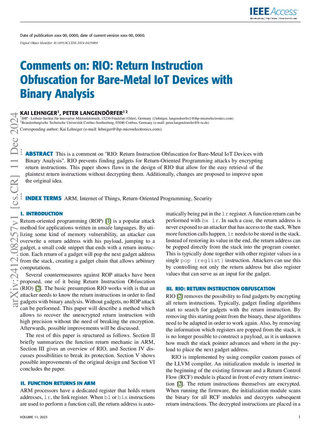 Comments on: RIO: Return Instruction Obfuscation for Bare-Metal IoT