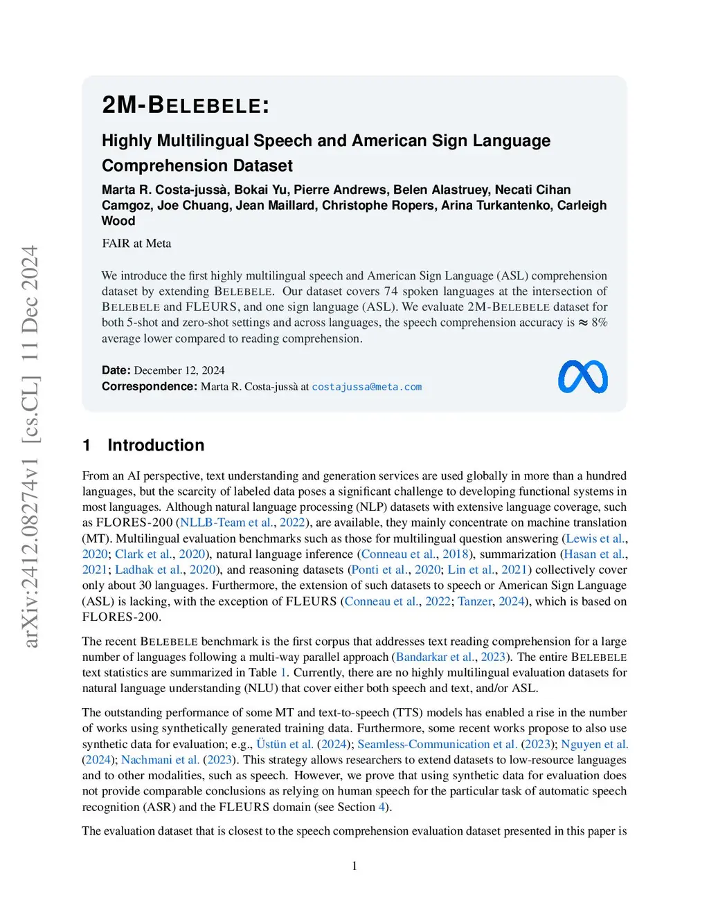 We introduce the first highly multilingual speech and American Sign Language (ASL) comprehension dataset by extending BELEBELE. Our dataset covers 74 spoken languages at the intersection of BELEBELE and FLEURS, and one sign language (ASL). We evaluate 2M-BELEBELE dataset for both 5-shot and zero-shot settings and across languages, the speech comprehension accuracy is ~ 2-3% average lower compared to reading comprehension.