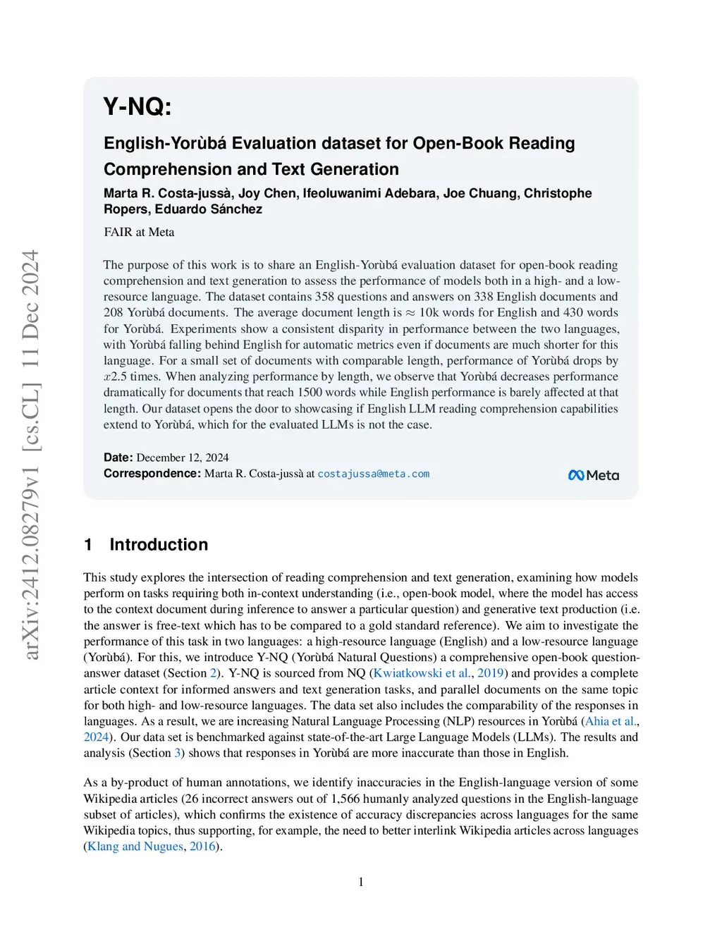 The purpose of this work is to share an English-Yor\`ub\á evaluation dataset for open-book reading comprehension and text generation to assess the performance of models both in a high- and a low- resource language. The dataset contains 358 questions and answers on 338 English documents and 208 Yor\`ub\á documents. The average document length is ~ 10k words for English and 430 words for Yor\`ub\á. Experiments show a consistent disparity in performance between the two languages, with Yor\`ub\á falling behind English for automatic metrics even if documents are much shorter for this language. For a small set of documents with comparable length, performance of Yor\`ub\á drops by x2.5 times. When analyzing performance by length, we observe that Yor\`ub\á decreases performance dramatically for documents that reach 1500 words while English performance is barely affected at that length. Our dataset opens the door to showcasing if English LLM reading comprehension capabilities extend to Yor\`ub\á, which for the evaluated LLMs is not the case.