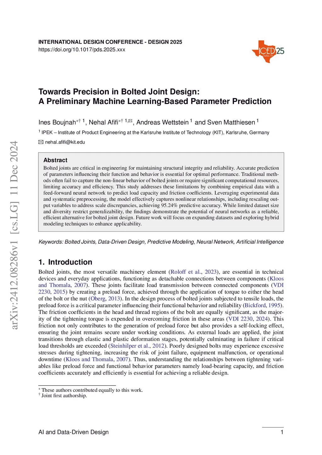 Bolted joints are critical in engineering for maintaining structural integrity and reliability. Accurate prediction of parameters influencing their function and behavior is essential for optimal performance. Traditional methods often fail to capture the non-linear behavior of bolted joints or require significant computational resources, limiting accuracy and efficiency. This study addresses these limitations by combining empirical data with a feed-forward neural network to predict load capacity and friction coefficients. Leveraging experimental data and systematic preprocessing, the model effectively captures nonlinear relationships, including rescaling output variables to address scale discrepancies, achieving 95.24% predictive accuracy. While limited dataset size and diversity restrict generalizability, the findings demonstrate the potential of neural networks as a reliable, efficient alternative for bolted joint design. Future work will focus on expanding datasets and exploring hybrid modeling techniques to enhance applicability.