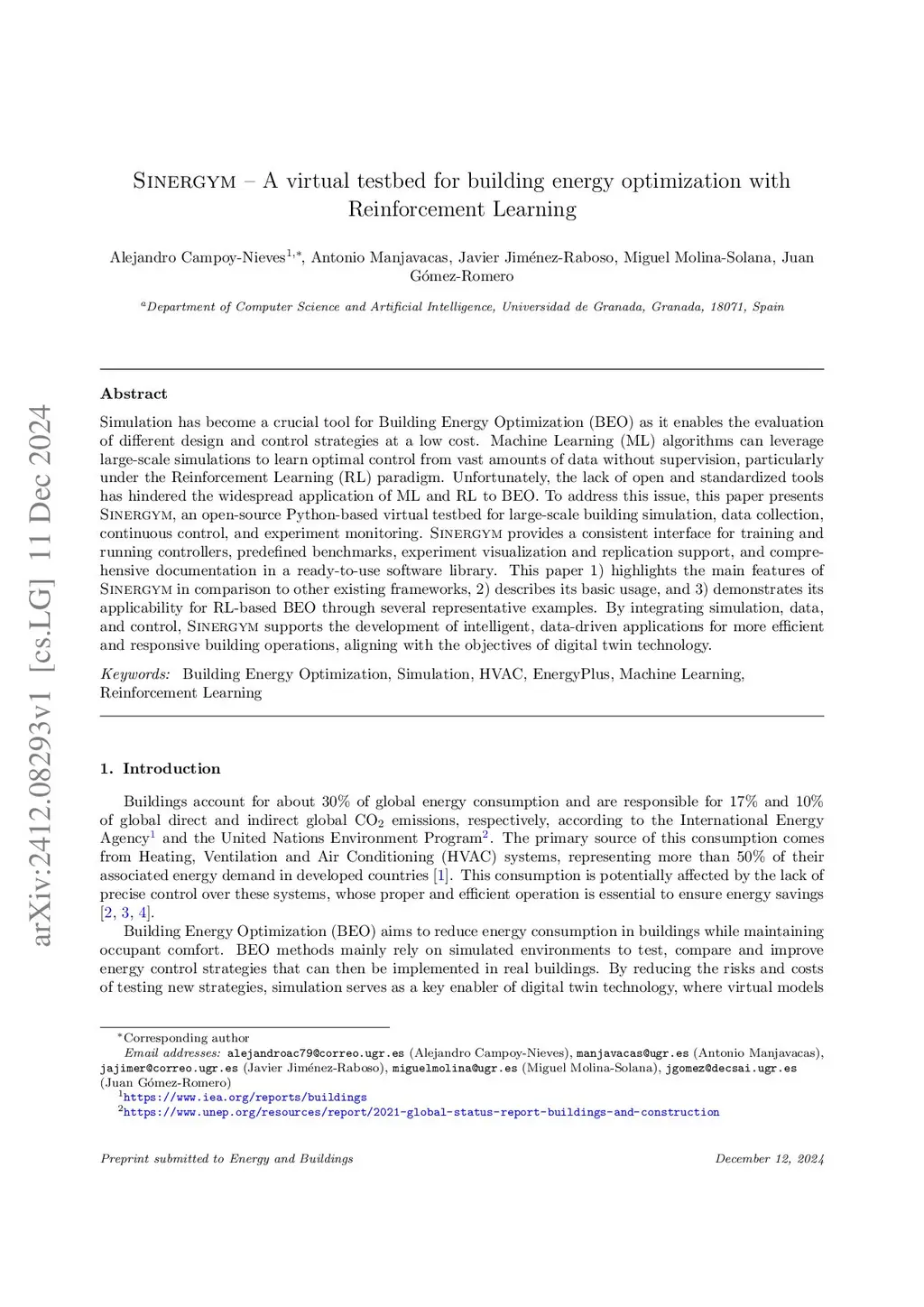 Simulation has become a crucial tool for Building Energy Optimization (BEO) as it enables the evaluation of different design and control strategies at a low cost. Machine Learning (ML) algorithms can leverage large-scale simulations to learn optimal control from vast amounts of data without supervision, particularly under the Reinforcement Learning (RL) paradigm. Unfortunately, the lack of open and standardized tools has hindered the widespread application of ML and RL to BEO. To address this issue, this paper presents Sinergym, an open-source Python-based virtual testbed for large-scale building simulation, data collection, continuous control, and experiment monitoring. Sinergym provides a consistent interface for training and running controllers, predefined benchmarks, experiment visualization and replication support, and comprehensive documentation in a ready-to-use software library. This paper 1) highlights the main features of Sinergym in comparison to other existing frameworks, 2) describes its basic usage, and 3) demonstrates its applicability for RL-based BEO through several representative examples. By integrating simulation, data, and control, Sinergym supports the development of intelligent, data-driven applications for more efficient and responsive building operations, aligning with the objectives of digital twin technology.