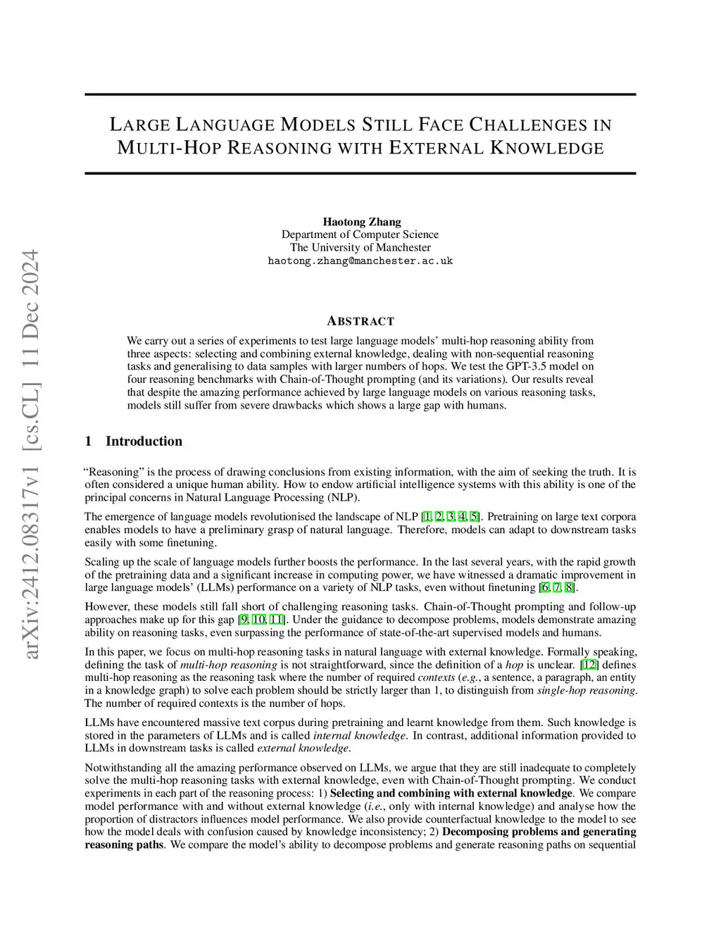 We carry out a series of experiments to test large language models' multi-hop reasoning ability from three aspects: selecting and combining external knowledge, dealing with non-sequential reasoning tasks and generalising to data samples with larger numbers of hops. We test the GPT-3.5 model on four reasoning benchmarks with Chain-of-Thought prompting (and its variations). Our results reveal that despite the amazing performance achieved by large language models on various reasoning tasks, models still suffer from severe drawbacks which shows a large gap with humans.