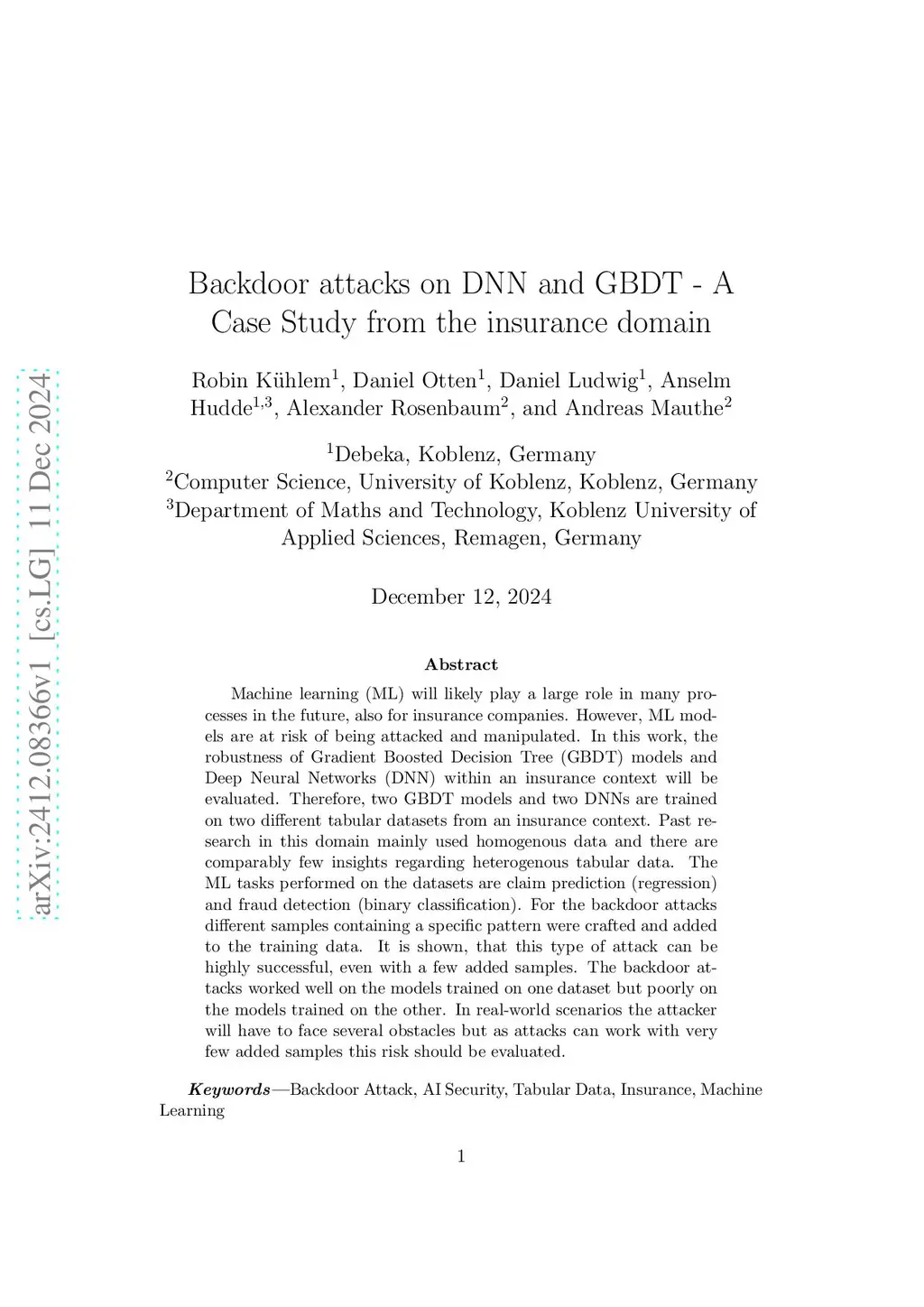 Backdoor attacks on DNN and GBDT -- A Case Study from the insurance