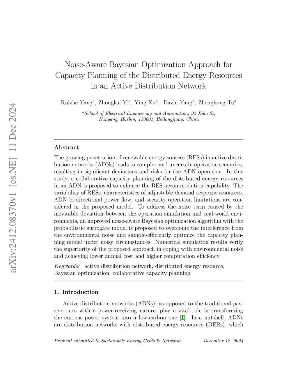 The growing penetration of renewable energy sources (RESs) in active distribution networks (ADNs) leads to complex and uncertain operation scenarios, resulting in significant deviations and risks for the ADN operation. In this study, a collaborative capacity planning of the distributed energy resources in an ADN is proposed to enhance the RES accommodation capability. The variability of RESs, characteristics of adjustable demand response resources, ADN bi-directional power flow, and security operation limitations are considered in the proposed model. To address the noise term caused by the inevitable deviation between the operation simulation and real-world environments, an improved noise-aware Bayesian optimization algorithm with the probabilistic surrogate model is proposed to overcome the interference from the environmental noise and sample-efficiently optimize the capacity planning model under noisy circumstances. Numerical simulation results verify the superiority of the proposed approach in coping with environmental noise and achieving lower annual cost and higher computation efficiency.