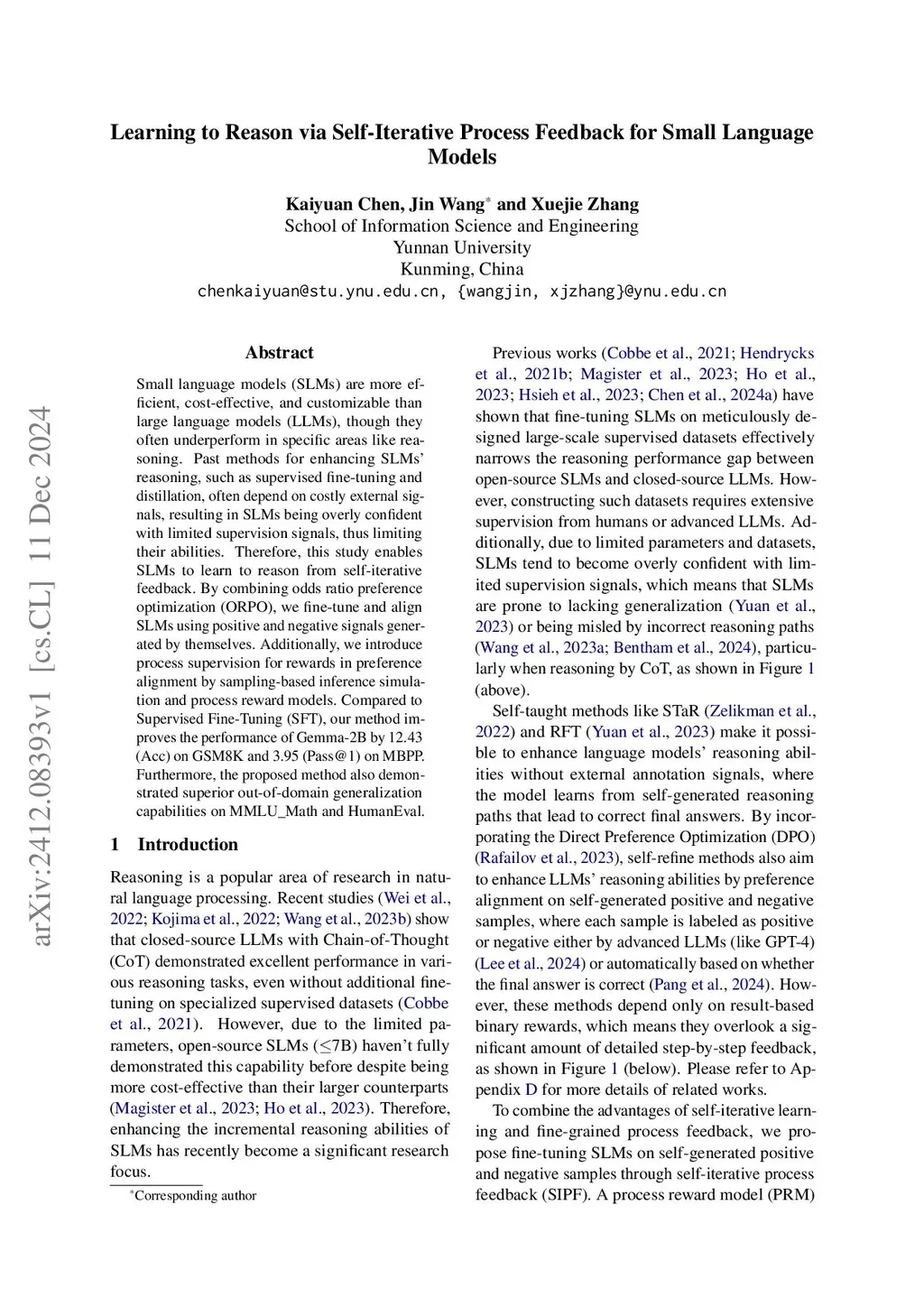Small language models (SLMs) are more efficient, cost-effective, and customizable than large language models (LLMs), though they often underperform in specific areas like reasoning. Past methods for enhancing SLMs' reasoning, such as supervised fine-tuning and distillation, often depend on costly external signals, resulting in SLMs being overly confident with limited supervision signals, thus limiting their abilities. Therefore, this study enables SLMs to learn to reason from self-iterative feedback. By combining odds ratio preference optimization (ORPO), we fine-tune and align SLMs using positive and negative signals generated by themselves. Additionally, we introduce process supervision for rewards in preference alignment by sampling-based inference simulation and process reward models. Compared to Supervised Fine-Tuning (SFT), our method improves the performance of Gemma-2B by 12.43 (Acc) on GSM8K and 3.95 (Pass@1) on MBPP. Furthermore, the proposed method also demonstrated superior out-of-domain generalization capabilities on MMLU_Math and HumanEval.