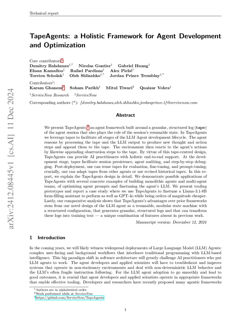 We present TapeAgents, an agent framework built around a granular, structured log tape of the agent session that also plays the role of the session's resumable state. In TapeAgents we leverage tapes to facilitate all stages of the LLM Agent development lifecycle. The agent reasons by processing the tape and the LLM output to produce new thought and action steps and append them to the tape. The environment then reacts to the agent's actions by likewise appending observation steps to the tape. By virtue of this tape-centred design, TapeAgents can provide AI practitioners with holistic end-to-end support. At the development stage, tapes facilitate session persistence, agent auditing, and step-by-step debugging. Post-deployment, one can reuse tapes for evaluation, fine-tuning, and prompt-tuning; crucially, one can adapt tapes from other agents or use revised historical tapes. In this report, we explain the TapeAgents design in detail. We demonstrate possible applications of TapeAgents with several concrete examples of building monolithic agents and multi-agent teams, of optimizing agent prompts and finetuning the agent's LLM. We present tooling prototypes and report a case study where we use TapeAgents to finetune a Llama-3.1-8B form-filling assistant to perform as well as GPT-4o while being orders of magnitude cheaper. Lastly, our comparative analysis shows that TapeAgents's advantages over prior frameworks stem from our novel design of the LLM agent as a resumable, modular state machine with a structured configuration, that generates granular, structured logs and that can transform these logs into training text -- a unique combination of features absent in previous work.