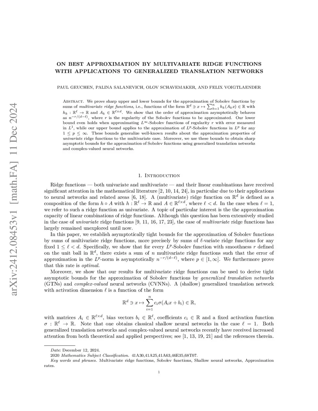 In this paper, we prove sharp upper and lower bounds for the approximation of Sobolev functions by sums of multivariate ridge functions, i.e., for approximation by functions of the form with and . We show that the order of approximation asymptotically behaves as , where is the regularity (order of differentiability) of the Sobolev functions to be approximated. Our lower bound even holds when approximating -Sobolev functions of regularity with error measured in , while our upper bound applies to the approximation of -Sobolev functions in for any . These bounds generalize well-known results regarding the approximation properties of univariate ridge functions to the multivariate case. We use our results to obtain sharp asymptotic bounds for the approximation of Sobolev functions using generalized translation networks and complex-valued neural networks.