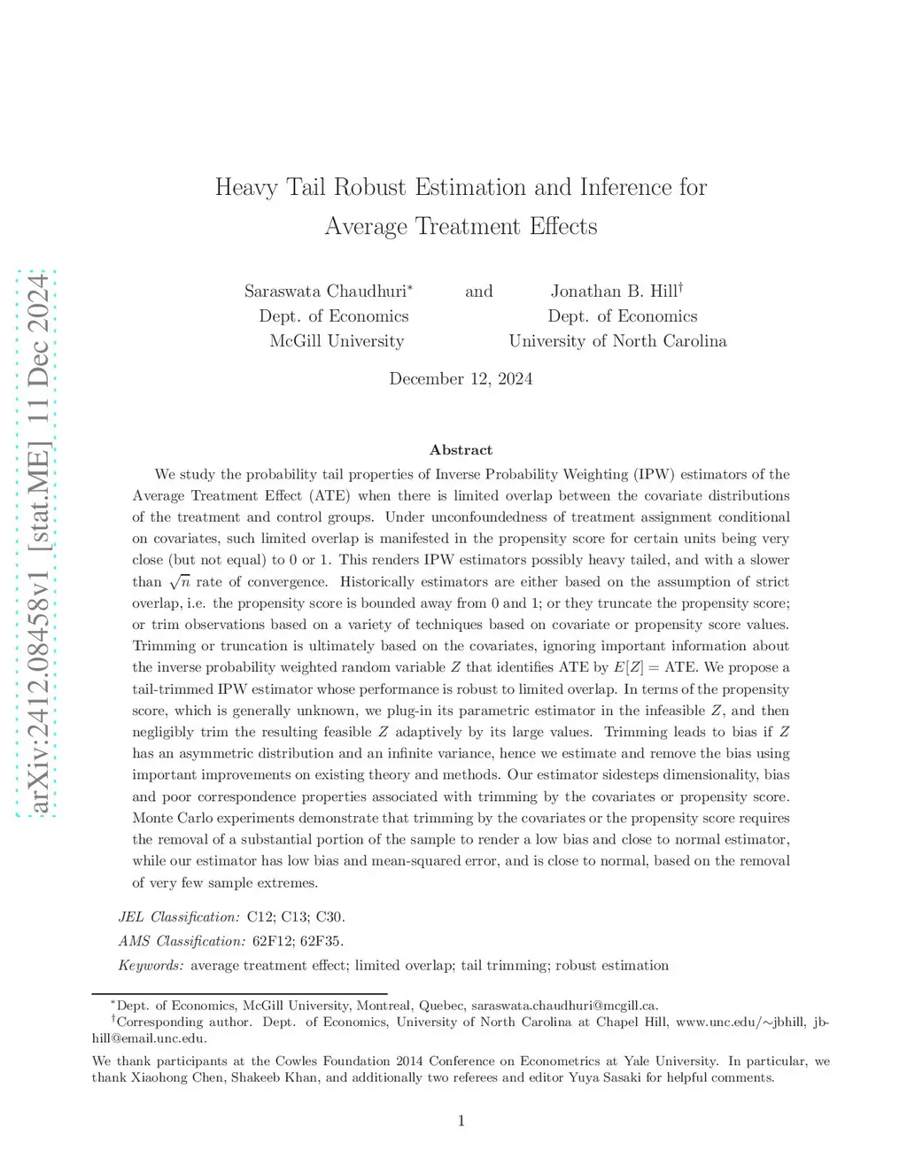 We study the probability tail properties of Inverse Probability Weighting (IPW) estimators of the Average Treatment Effect (ATE) when there is limited overlap between the covariate distributions of the treatment and control groups. Under unconfoundedness of treatment assignment conditional on covariates, such limited overlap is manifested in the propensity score for certain units being very close (but not equal) to 0 or 1. This renders IPW estimators possibly heavy tailed, and with a slower than sqrt(n) rate of convergence. Trimming or truncation is ultimately based on the covariates, ignoring important information about the inverse probability weighted random variable Z that identifies ATE by E[Z]= ATE. We propose a tail-trimmed IPW estimator whose performance is robust to limited overlap. In terms of the propensity score, which is generally unknown, we plug-in its parametric estimator in the infeasible Z, and then negligibly trim the resulting feasible Z adaptively by its large values. Trimming leads to bias if Z has an asymmetric distribution and an infinite variance, hence we estimate and remove the bias using important improvements on existing theory and methods. Our estimator sidesteps dimensionality, bias and poor correspondence properties associated with trimming by the covariates or propensity score. Monte Carlo experiments demonstrate that trimming by the covariates or the propensity score requires the removal of a substantial portion of the sample to render a low bias and close to normal estimator, while our estimator has low bias and mean-squared error, and is close to normal, based on the removal of very few sample extremes.