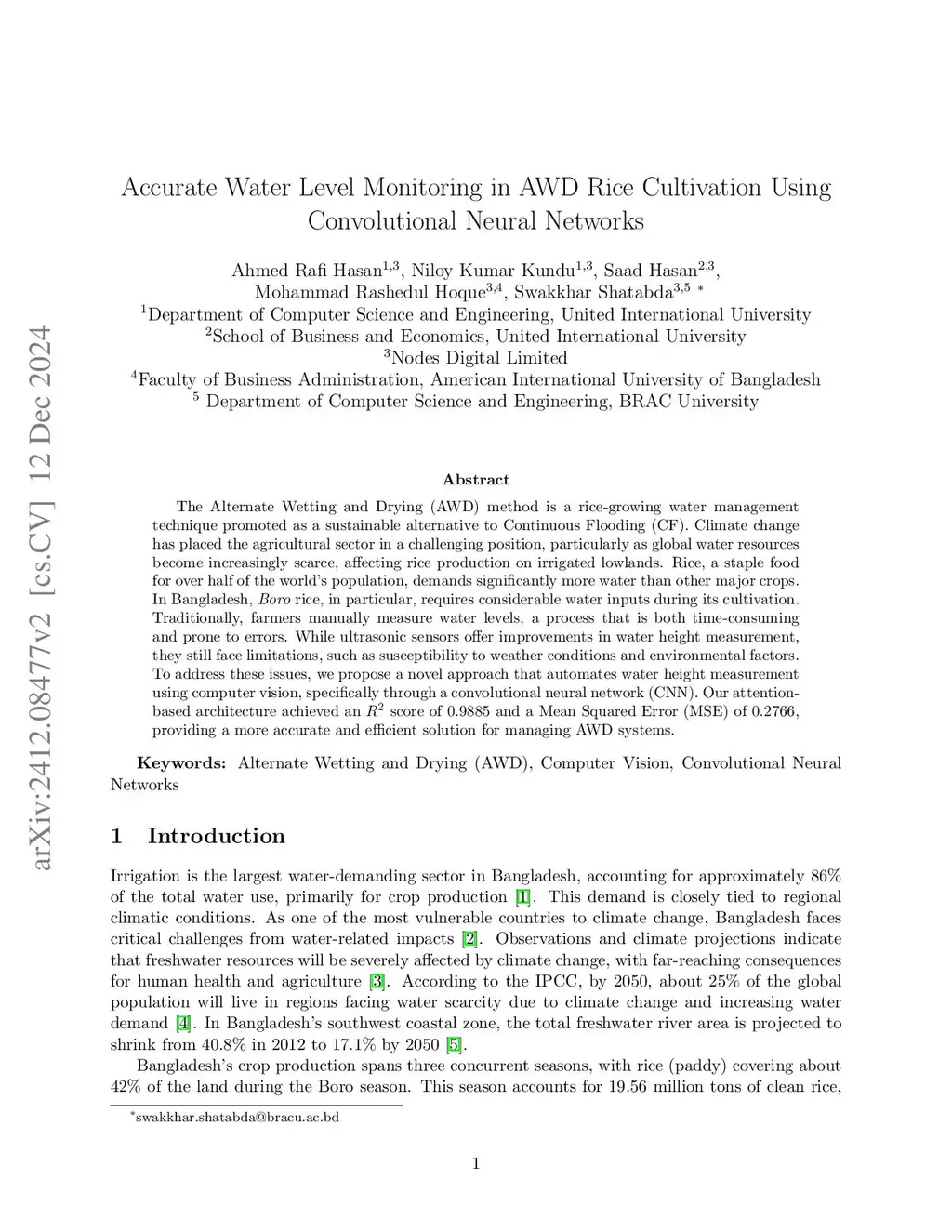 The Alternate Wetting and Drying (AWD) method is a rice-growing water management technique promoted as a sustainable alternative to Continuous Flooding (CF). Climate change has placed the agricultural sector in a challenging position, particularly as global water resources become increasingly scarce, affecting rice production on irrigated lowlands. Rice, a staple food for over half of the world's population, demands significantly more water than other major crops. In Bangladesh, Boro rice, in particular, requires considerable water inputs during its cultivation. Traditionally, farmers manually measure water levels, a process that is both time-consuming and prone to errors. While ultrasonic sensors offer improvements in water height measurement, they still face limitations, such as susceptibility to weather conditions and environmental factors. To address these issues, we propose a novel approach that automates water height measurement using computer vision, specifically through a convolutional neural network (CNN). Our attention-based architecture achieved an score of 0.9885 and a Mean Squared Error (MSE) of 0.2766, providing a more accurate and efficient solution for managing AWD systems.