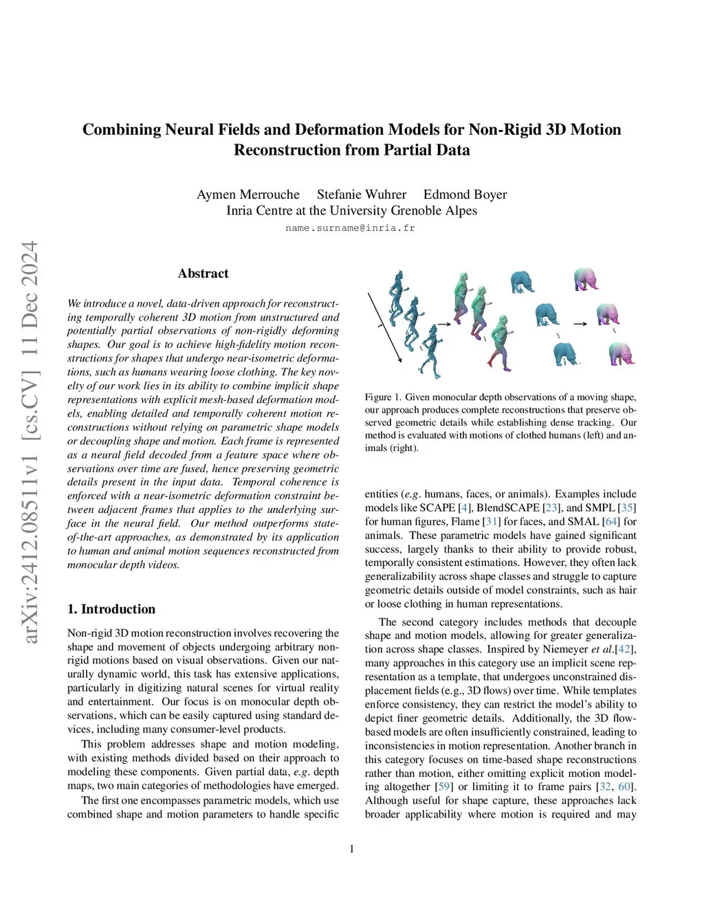 We introduce a novel, data-driven approach for reconstructing temporally coherent 3D motion from unstructured and potentially partial observations of non-rigidly deforming shapes. Our goal is to achieve high-fidelity motion reconstructions for shapes that undergo near-isometric deformations, such as humans wearing loose clothing. The key novelty of our work lies in its ability to combine implicit shape representations with explicit mesh-based deformation models, enabling detailed and temporally coherent motion reconstructions without relying on parametric shape models or decoupling shape and motion. Each frame is represented as a neural field decoded from a feature space where observations over time are fused, hence preserving geometric details present in the input data. Temporal coherence is enforced with a near-isometric deformation constraint between adjacent frames that applies to the underlying surface in the neural field. Our method outperforms state-of-the-art approaches, as demonstrated by its application to human and animal motion sequences reconstructed from monocular depth videos.