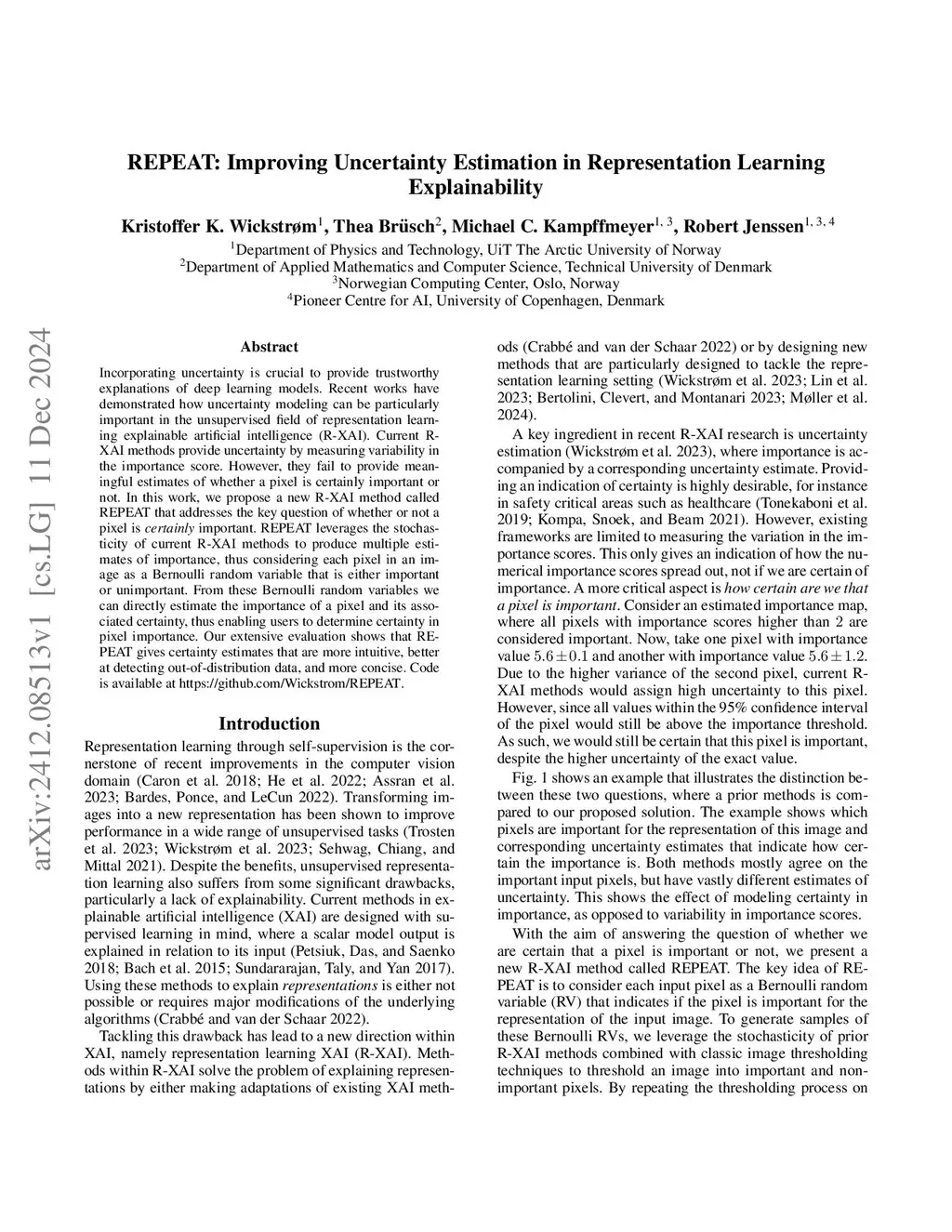 Incorporating uncertainty is crucial to provide trustworthy explanations of deep learning models. Recent works have demonstrated how uncertainty modeling can be particularly important in the unsupervised field of representation learning explainable artificial intelligence (R-XAI). Current R-XAI methods provide uncertainty by measuring variability in the importance score. However, they fail to provide meaningful estimates of whether a pixel is certainly important or not. In this work, we propose a new R-XAI method called REPEAT that addresses the key question of whether or not a pixel is \textit{certainly} important. REPEAT leverages the stochasticity of current R-XAI methods to produce multiple estimates of importance, thus considering each pixel in an image as a Bernoulli random variable that is either important or unimportant. From these Bernoulli random variables we can directly estimate the importance of a pixel and its associated certainty, thus enabling users to determine certainty in pixel importance. Our extensive evaluation shows that REPEAT gives certainty estimates that are more intuitive, better at detecting out-of-distribution data, and more concise.