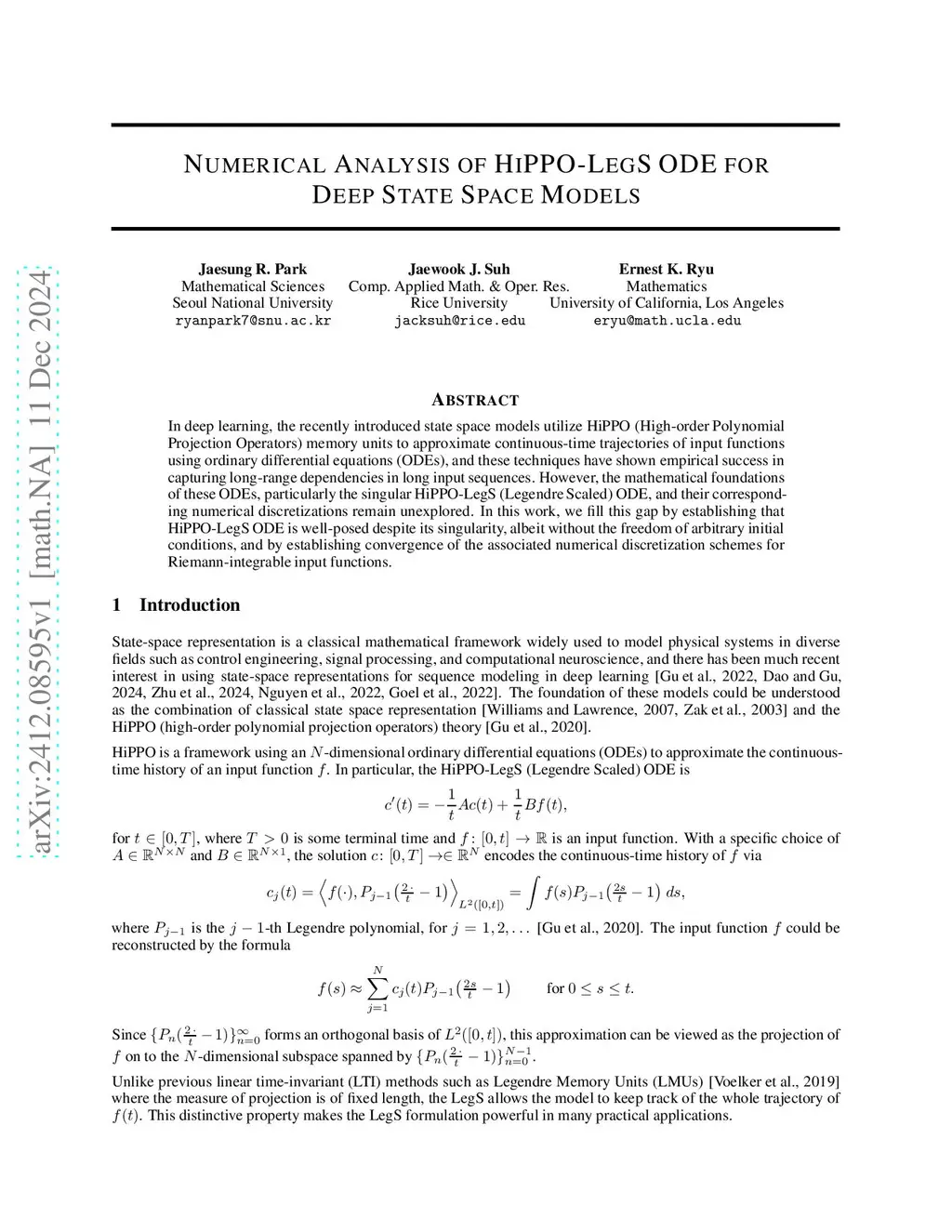 In deep learning, the recently introduced state space models utilize HiPPO (High-order Polynomial Projection Operators) memory units to approximate continuous-time trajectories of input functions using ordinary differential equations (ODEs), and these techniques have shown empirical success in capturing long-range dependencies in long input sequences. However, the mathematical foundations of these ODEs, particularly the singular HiPPO-LegS (Legendre Scaled) ODE, and their corresponding numerical discretizations remain unsettled. In this work, we fill this gap by establishing that HiPPO-LegS ODE is well-posed despite its singularity, albeit without the freedom of arbitrary initial conditions. Further, we establish convergence of the associated numerical discretization schemes for Riemann integrable input functions.