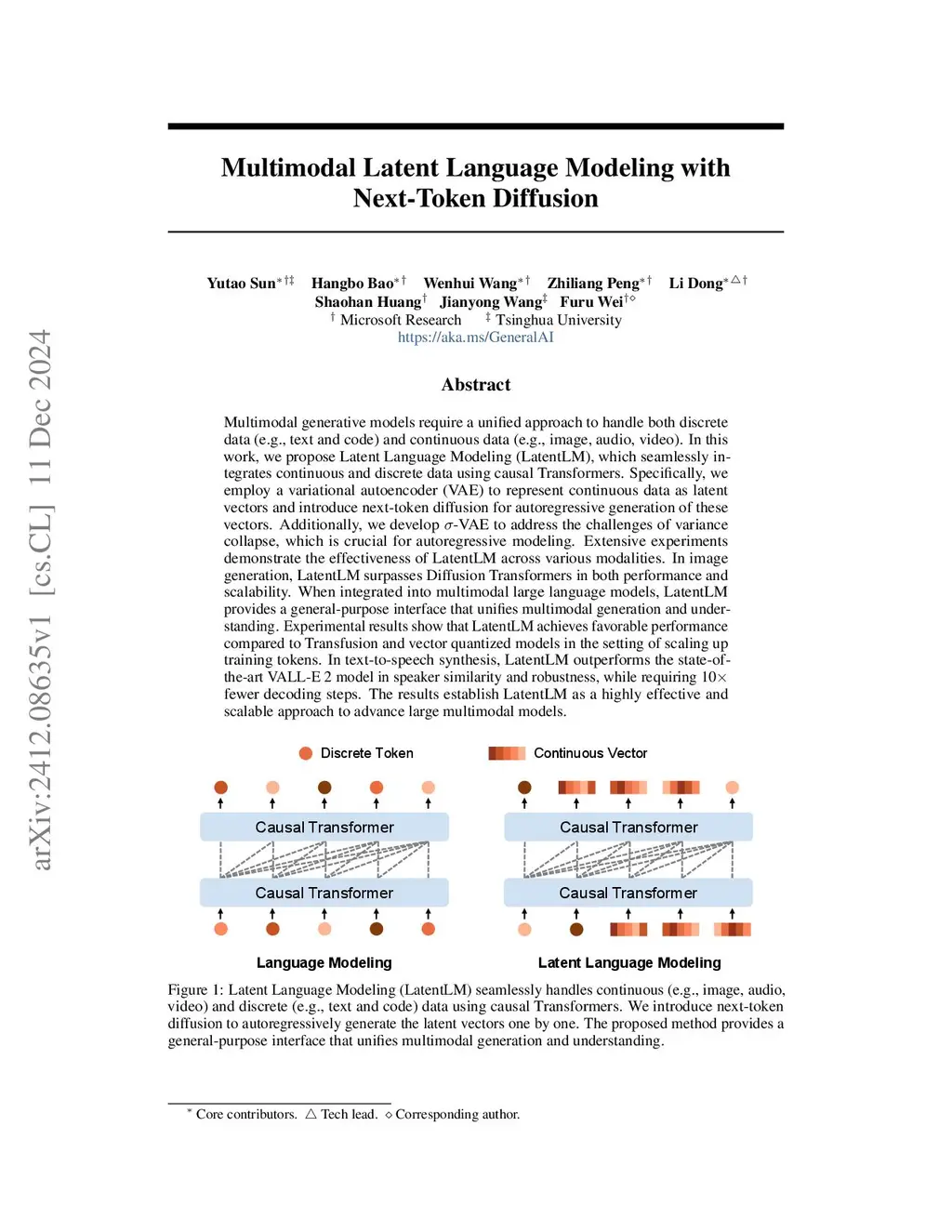 Multimodal generative models require a unified approach to handle both discrete data (e.g., text and code) and continuous data (e.g., image, audio, video). In this work, we propose Latent Language Modeling (LatentLM), which seamlessly integrates continuous and discrete data using causal Transformers. Specifically, we employ a variational autoencoder (VAE) to represent continuous data as latent vectors and introduce next-token diffusion for autoregressive generation of these vectors. Additionally, we develop -VAE to address the challenges of variance collapse, which is crucial for autoregressive modeling. Extensive experiments demonstrate the effectiveness of LatentLM across various modalities. In image generation, LatentLM surpasses Diffusion Transformers in both performance and scalability. When integrated into multimodal large language models, LatentLM provides a general-purpose interface that unifies multimodal generation and understanding. Experimental results show that LatentLM achieves favorable performance compared to Transfusion and vector quantized models in the setting of scaling up training tokens. In text-to-speech synthesis, LatentLM outperforms the state-of-the-art VALL-E 2 model in speaker similarity and robustness, while requiring 10x fewer decoding steps. The results establish LatentLM as a highly effective and scalable approach to advance large multimodal models.
