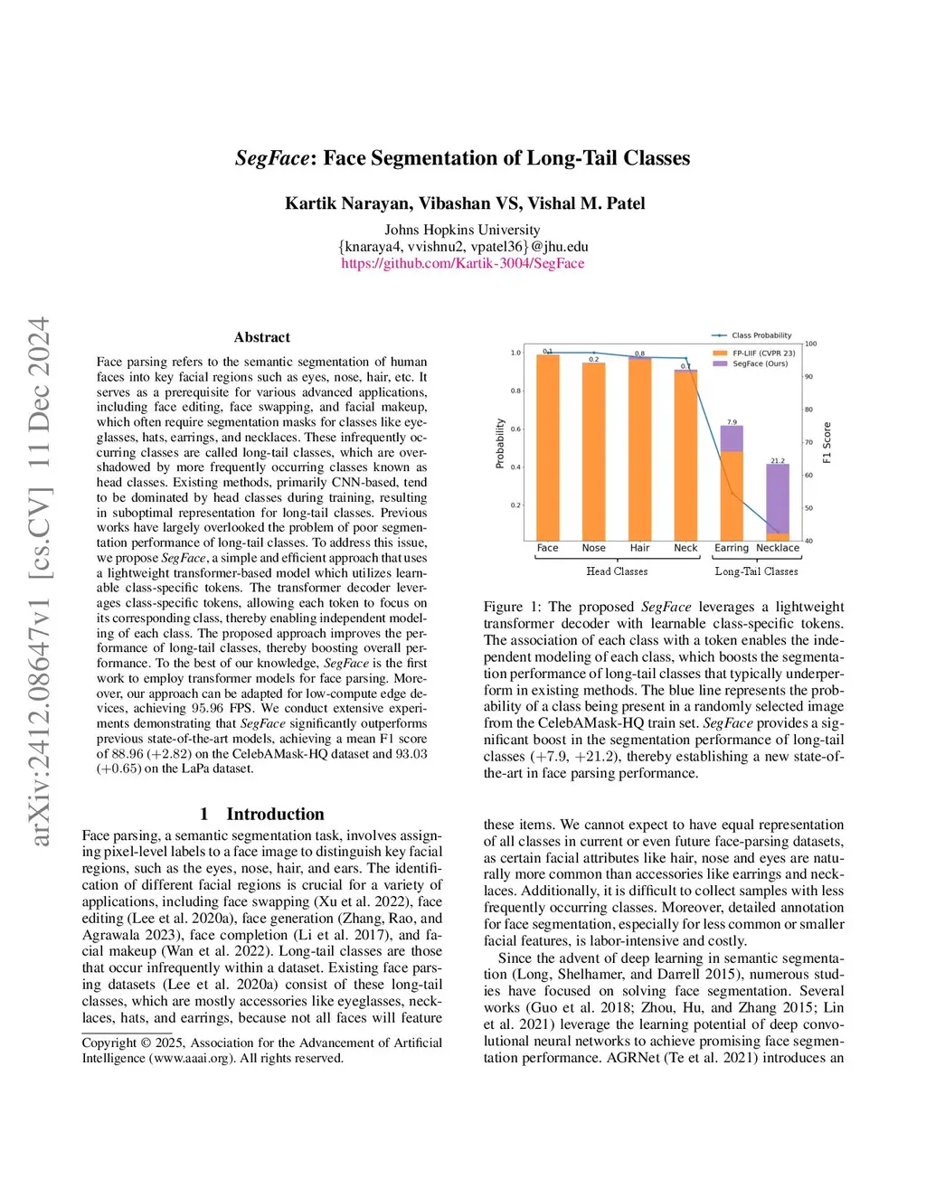 Face parsing refers to the semantic segmentation of human faces into key facial regions such as eyes, nose, hair, etc. It serves as a prerequisite for various advanced applications, including face editing, face swapping, and facial makeup, which often require segmentation masks for classes like eyeglasses, hats, earrings, and necklaces. These infrequently occurring classes are called long-tail classes, which are overshadowed by more frequently occurring classes known as head classes. Existing methods, primarily CNN-based, tend to be dominated by head classes during training, resulting in suboptimal representation for long-tail classes. Previous works have largely overlooked the problem of poor segmentation performance of long-tail classes. To address this issue, we propose SegFace, a simple and efficient approach that uses a lightweight transformer-based model which utilizes learnable class-specific tokens. The transformer decoder leverages class-specific tokens, allowing each token to focus on its corresponding class, thereby enabling independent modeling of each class. The proposed approach improves the performance of long-tail classes, thereby boosting overall performance. To the best of our knowledge, SegFace is the first work to employ transformer models for face parsing. Moreover, our approach can be adapted for low-compute edge devices, achieving 95.96 FPS. We conduct extensive experiments demonstrating that SegFace significantly outperforms previous state-of-the-art models, achieving a mean F1 score of 88.96 (+2.82) on the CelebAMask-HQ dataset and 93.03 (+0.65) on the LaPa dataset. Code: https://github.com/Kartik-3004/SegFace