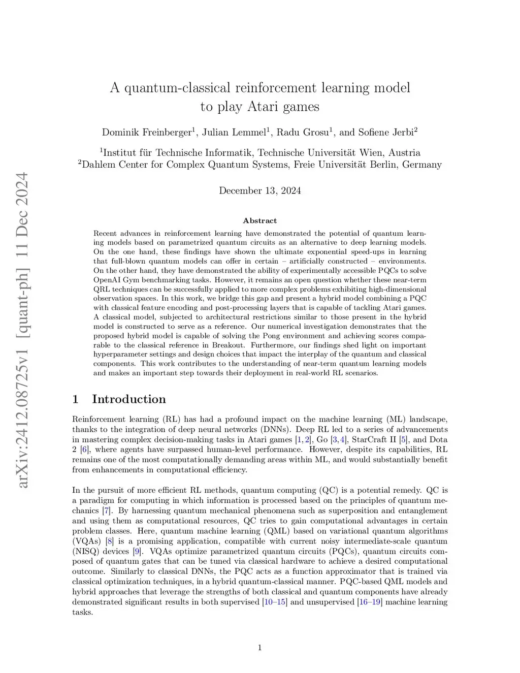 Recent advances in reinforcement learning have demonstrated the potential of quantum learning models based on parametrized quantum circuits as an alternative to deep learning models. On the one hand, these findings have shown the ultimate exponential speed-ups in learning that full-blown quantum models can offer in certain -- artificially constructed -- environments. On the other hand, they have demonstrated the ability of experimentally accessible PQCs to solve OpenAI Gym benchmarking tasks. However, it remains an open question whether these near-term QRL techniques can be successfully applied to more complex problems exhibiting high-dimensional observation spaces. In this work, we bridge this gap and present a hybrid model combining a PQC with classical feature encoding and post-processing layers that is capable of tackling Atari games. A classical model, subjected to architectural restrictions similar to those present in the hybrid model is constructed to serve as a reference. Our numerical investigation demonstrates that the proposed hybrid model is capable of solving the Pong environment and achieving scores comparable to the classical reference in Breakout. Furthermore, our findings shed light on important hyperparameter settings and design choices that impact the interplay of the quantum and classical components. This work contributes to the understanding of near-term quantum learning models and makes an important step towards their deployment in real-world RL scenarios.