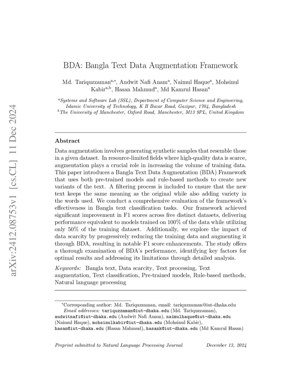 Data augmentation involves generating synthetic samples that resemble those in a given dataset. In resource-limited fields where high-quality data is scarce, augmentation plays a crucial role in increasing the volume of training data. This paper introduces a Bangla Text Data Augmentation (BDA) Framework that uses both pre-trained models and rule-based methods to create new variants of the text. A filtering process is included to ensure that the new text keeps the same meaning as the original while also adding variety in the words used. We conduct a comprehensive evaluation of the framework's effectiveness in Bangla text classification tasks. Our framework achieved significant improvement in F1 scores across five distinct datasets, delivering performance equivalent to models trained on 100% of the data while utilizing only 50% of the training dataset. Additionally, we explore the impact of data scarcity by progressively reducing the training data and augmenting it through BDA, resulting in notable F1 score enhancements. The study offers a thorough examination of BDA's performance, identifying key factors for optimal results and addressing its limitations through detailed analysis.