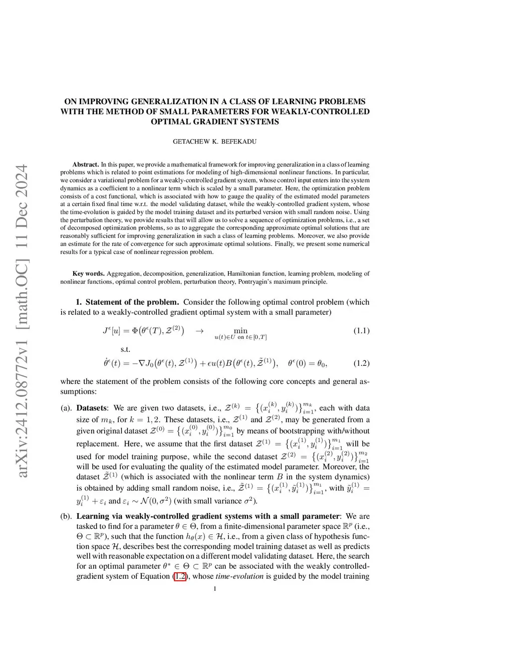 In this paper, we provide a mathematical framework for improving generalization in a class of learning problems which is related to point estimations for modeling of high-dimensional nonlinear functions. In particular, we consider a variational problem for a weakly-controlled gradient system, whose control input enters into the system dynamics as a coefficient to a nonlinear term which is scaled by a small parameter. Here, the optimization problem consists of a cost functional, which is associated with how to gauge the quality of the estimated model parameters at a certain fixed final time w.r.t. the model validating dataset, while the weakly-controlled gradient system, whose the time-evolution is guided by the model training dataset and its perturbed version with small random noise. Using the perturbation theory, we provide results that will allow us to solve a sequence of optimization problems, i.e., a set of decomposed optimization problems, so as to aggregate the corresponding approximate optimal solutions that are reasonably sufficient for improving generalization in such a class of learning problems. Moreover, we also provide an estimate for the rate of convergence for such approximate optimal solutions. Finally, we present some numerical results for a typical case of nonlinear regression problem.