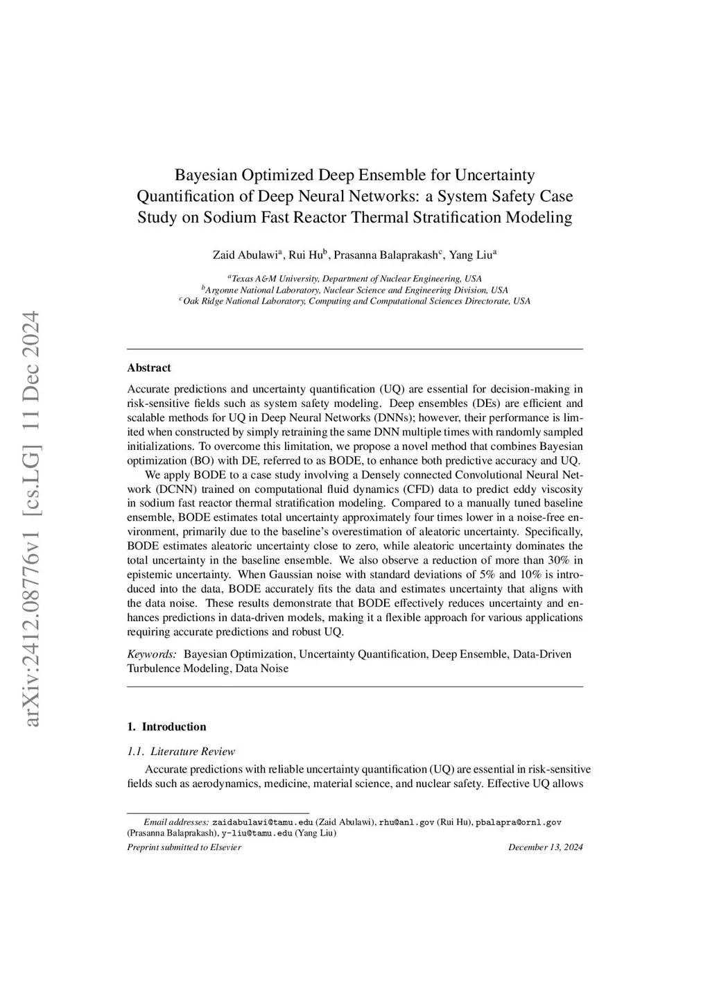 Accurate predictions and uncertainty quantification (UQ) are essential for decision-making in risk-sensitive fields such as system safety modeling. Deep ensembles (DEs) are efficient and scalable methods for UQ in Deep Neural Networks (DNNs); however, their performance is limited when constructed by simply retraining the same DNN multiple times with randomly sampled initializations. To overcome this limitation, we propose a novel method that combines Bayesian optimization (BO) with DE, referred to as BODE, to enhance both predictive accuracy and UQ. We apply BODE to a case study involving a Densely connected Convolutional Neural Network (DCNN) trained on computational fluid dynamics (CFD) data to predict eddy viscosity in sodium fast reactor thermal stratification modeling. Compared to a manually tuned baseline ensemble, BODE estimates total uncertainty approximately four times lower in a noise-free environment, primarily due to the baseline's overestimation of aleatoric uncertainty. Specifically, BODE estimates aleatoric uncertainty close to zero, while aleatoric uncertainty dominates the total uncertainty in the baseline ensemble. We also observe a reduction of more than 30% in epistemic uncertainty. When Gaussian noise with standard deviations of 5% and 10% is introduced into the data, BODE accurately fits the data and estimates uncertainty that aligns with the data noise. These results demonstrate that BODE effectively reduces uncertainty and enhances predictions in data-driven models, making it a flexible approach for various applications requiring accurate predictions and robust UQ.