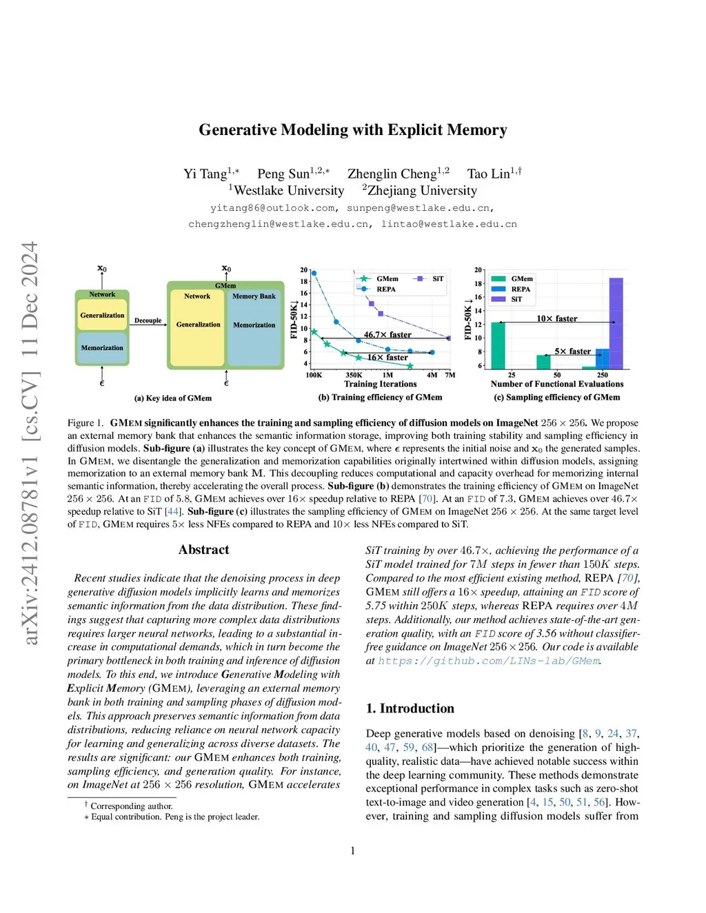 Recent studies indicate that the denoising process in deep generative diffusion models implicitly learns and memorizes semantic information from the data distribution. These findings suggest that capturing more complex data distributions requires larger neural networks, leading to a substantial increase in computational demands, which in turn become the primary bottleneck in both training and inference of diffusion models. To this end, we introduce GMem: A Modular Approach for Ultra-Efficient Generative Models. Our approach GMem decouples the memory capacity from model and implements it as a separate, immutable memory set that preserves the essential semantic information in the data. The results are significant: GMem enhances both training, sampling efficiency, and diversity generation. This design on one hand reduces the reliance on network for memorize complex data distribution and thus enhancing both training and sampling efficiency. On ImageNet at resolution, GMem achieves a training speedup compared to SiT, reaching FID in fewer than epochs ( hours training time), while SiT requires epochs. Without classifier-free guidance, GMem achieves state-of-the-art (SoTA) performance FID in epochs with only hours of training, outperforming LightningDiT which requires epochs and hours to attain FID .