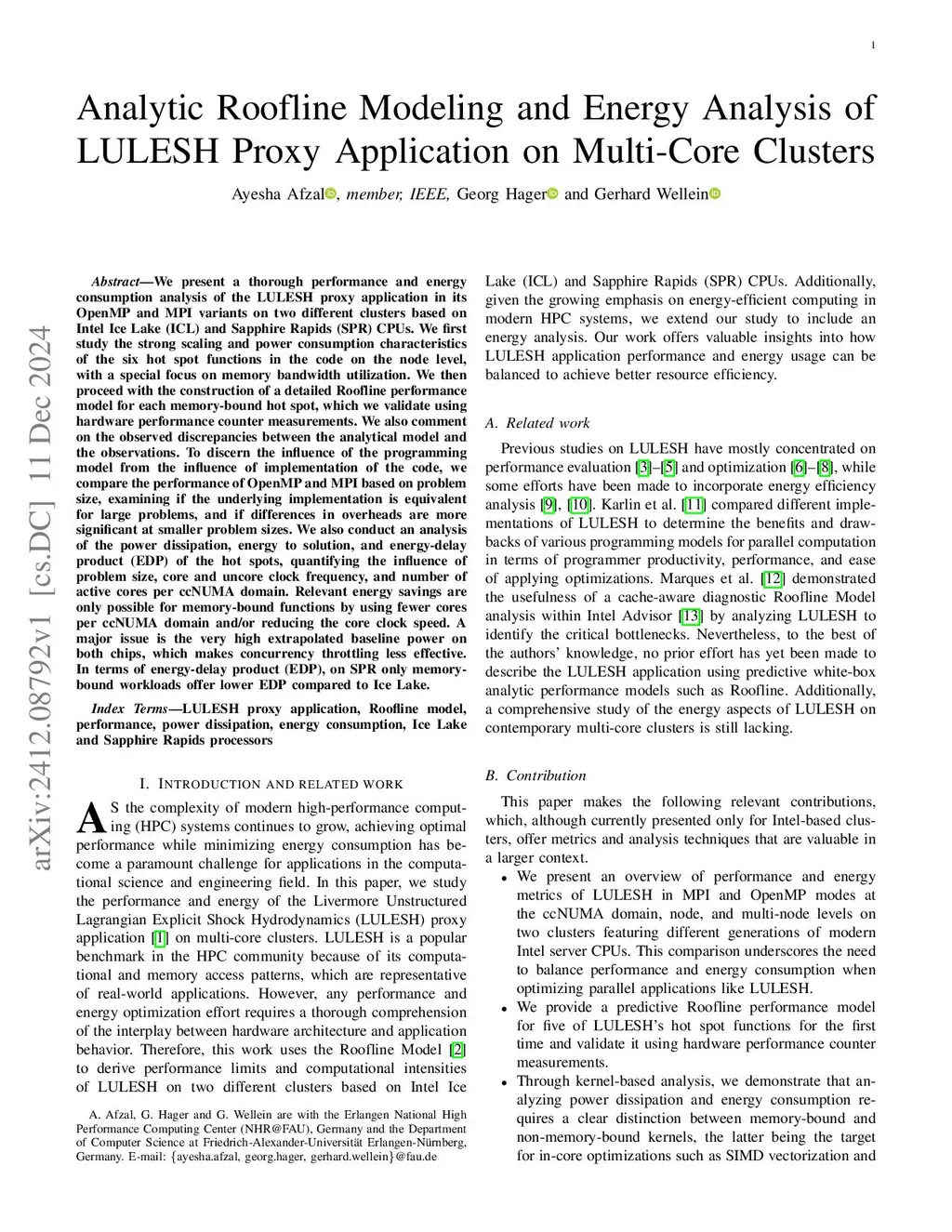 We present a thorough performance and energy consumption analysis of the LULESH proxy application in its OpenMP and MPI variants on two different clusters based on Intel Ice Lake (ICL) and Sapphire Rapids (SPR) CPUs. We first study the strong scaling and power consumption characteristics of the six hot spot functions in the code on the node level, with a special focus on memory bandwidth utilization. We then proceed with the construction of a detailed Roofline performance model for each memory-bound hot spot, which we validate using hardware performance counter measurements. We also comment on the observed discrepancies between the analytical model and the observations. To discern the influence of the programming model from the influence of implementation of the code, we compare the performance of OpenMP and MPI based on problem size, examining if the underlying implementation is equivalent for large problems, and if differences in overheads are more significant at smaller problem sizes. We also conduct an analysis of the power dissipation, energy to solution, and energy-delay product (EDP) of the hot spots, quantifying the influence of problem size, core and uncore clock frequency, and number of active cores per ccNUMA domain. Relevant energy savings are only possible for memory-bound functions by using fewer cores per ccNUMA domain and/or reducing the core clock speed. A major issue is the very high extrapolated baseline power on both chips, which makes concurrency throttling less effective. In terms of energy-delay product (EDP), on SPR only memory-bound workloads offer lower EDP compared to Ice Lake.