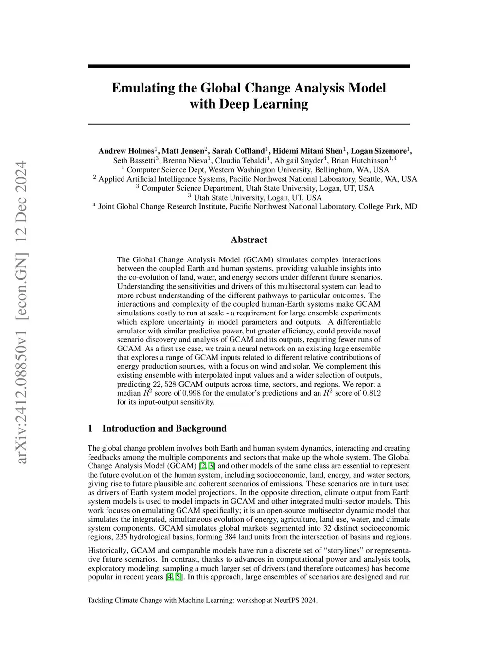 The Global Change Analysis Model (GCAM) simulates complex interactions between the coupled Earth and human systems, providing valuable insights into the co-evolution of land, water, and energy sectors under different future scenarios. Understanding the sensitivities and drivers of this multisectoral system can lead to more robust understanding of the different pathways to particular outcomes. The interactions and complexity of the coupled human-Earth systems make GCAM simulations costly to run at scale - a requirement for large ensemble experiments which explore uncertainty in model parameters and outputs. A differentiable emulator with similar predictive power, but greater efficiency, could provide novel scenario discovery and analysis of GCAM and its outputs, requiring fewer runs of GCAM. As a first use case, we train a neural network on an existing large ensemble that explores a range of GCAM inputs related to different relative contributions of energy production sources, with a focus on wind and solar. We complement this existing ensemble with interpolated input values and a wider selection of outputs, predicting 22,528 GCAM outputs across time, sectors, and regions. We report a median score of 0.998 for the emulator's predictions and an score of 0.812 for its input-output sensitivity.