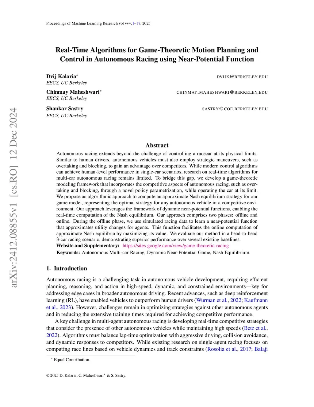 Autonomous racing extends beyond the challenge of controlling a racecar at its physical limits. Professional racers employ strategic maneuvers to outwit other competing opponents to secure victory. While modern control algorithms can achieve human-level performance by computing offline racing lines for single-car scenarios, research on real-time algorithms for multi-car autonomous racing is limited. To bridge this gap, we develop game-theoretic modeling framework that incorporates the competitive aspect of autonomous racing like overtaking and blocking through a novel policy parametrization, while operating the car at its limit. Furthermore, we propose an algorithmic approach to compute the (approximate) Nash equilibrium strategy, which represents the optimal approach in the presence of competing agents. Specifically, we introduce an algorithm inspired by recently introduced framework of dynamic near-potential function, enabling real-time computation of the Nash equilibrium. Our approach comprises two phases: offline and online. During the offline phase, we use simulated racing data to learn a near-potential function that approximates utility changes for agents. This function facilitates the online computation of approximate Nash equilibria by maximizing its value. We evaluate our method in a head-to-head 3-car racing scenario, demonstrating superior performance compared to several existing baselines.