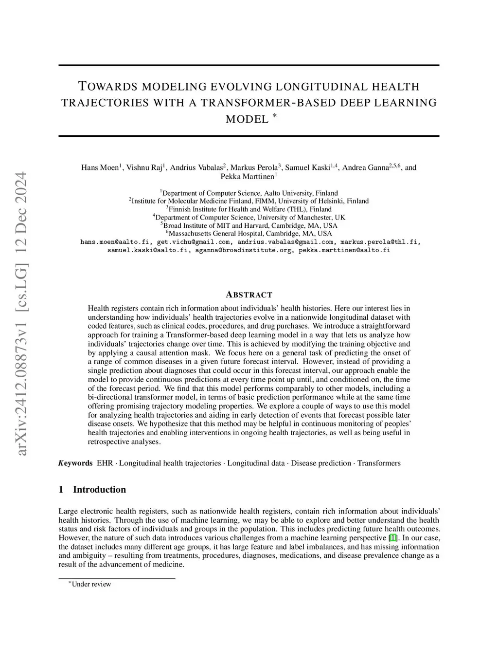 Health registers contain rich information about individuals' health histories. Here our interest lies in understanding how individuals' health trajectories evolve in a nationwide longitudinal dataset with coded features, such as clinical codes, procedures, and drug purchases. We introduce a straightforward approach for training a Transformer-based deep learning model in a way that lets us analyze how individuals' trajectories change over time. This is achieved by modifying the training objective and by applying a causal attention mask. We focus here on a general task of predicting the onset of a range of common diseases in a given future forecast interval. However, instead of providing a single prediction about diagnoses that could occur in this forecast interval, our approach enable the model to provide continuous predictions at every time point up until, and conditioned on, the time of the forecast period. We find that this model performs comparably to other models, including a bi-directional transformer model, in terms of basic prediction performance while at the same time offering promising trajectory modeling properties. We explore a couple of ways to use this model for analyzing health trajectories and aiding in early detection of events that forecast possible later disease onsets. We hypothesize that this method may be helpful in continuous monitoring of peoples' health trajectories and enabling interventions in ongoing health trajectories, as well as being useful in retrospective analyses.
