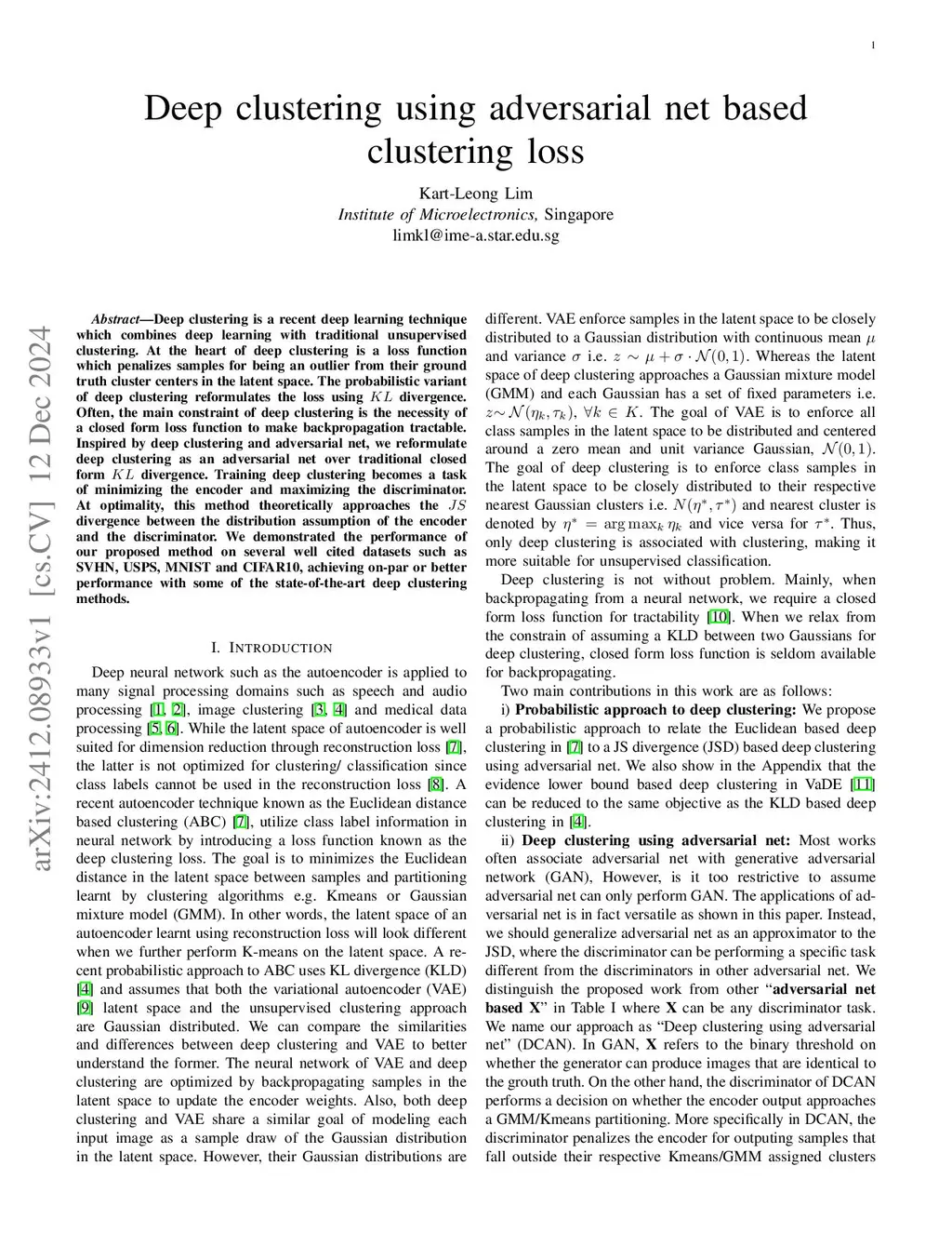 Deep clustering is a recent deep learning technique which combines deep learning with traditional unsupervised clustering. At the heart of deep clustering is a loss function which penalizes samples for being an outlier from their ground truth cluster centers in the latent space. The probabilistic variant of deep clustering reformulates the loss using KL divergence. Often, the main constraint of deep clustering is the necessity of a closed form loss function to make backpropagation tractable. Inspired by deep clustering and adversarial net, we reformulate deep clustering as an adversarial net over traditional closed form KL divergence. Training deep clustering becomes a task of minimizing the encoder and maximizing the discriminator. At optimality, this method theoretically approaches the JS divergence between the distribution assumption of the encoder and the discriminator. We demonstrated the performance of our proposed method on several well cited datasets such as MNIST, REUTERS10K and CIFAR10, achieving on-par or better performance with some of the state-of-the-art deep clustering methods.