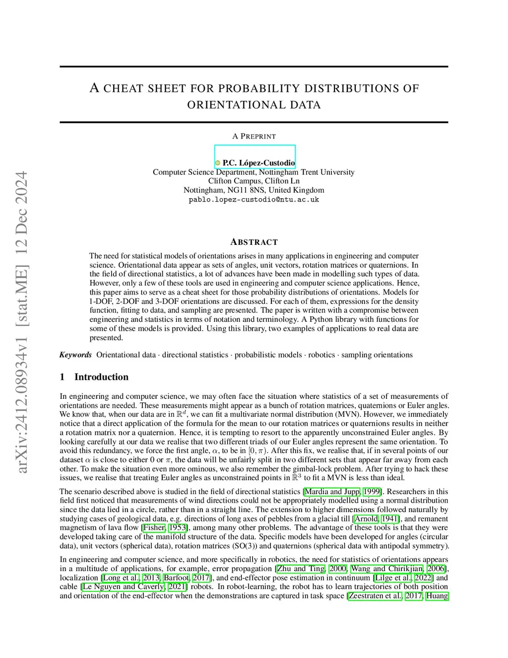 The need for statistical models of orientations arises in many applications in engineering and computer science. Orientational data appear as sets of angles, unit vectors, rotation matrices or quaternions. In the field of directional statistics, a lot of advances have been made in modelling such types of data. However, only a few of these tools are used in engineering and computer science applications. Hence, this paper aims to serve as a cheat sheet for those probability distributions of orientations. Models for 1-DOF, 2-DOF and 3-DOF orientations are discussed. For each of them, expressions for the density function, fitting to data, and sampling are presented. The paper is written with a compromise between engineering and statistics in terms of notation and terminology. A Python library with functions for some of these models is provided. Using this library, two examples of applications to real data are presented.
