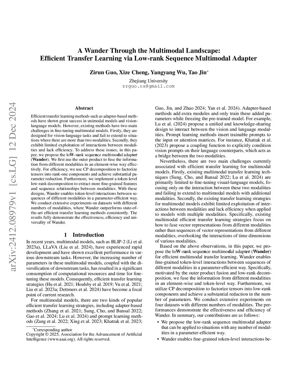 Efficient transfer learning methods such as adapter-based methods have shown great success in unimodal models and vision-language models. However, existing methods have two main challenges in fine-tuning multimodal models. Firstly, they are designed for vision-language tasks and fail to extend to situations where there are more than two modalities. Secondly, they exhibit limited exploitation of interactions between modalities and lack efficiency. To address these issues, in this paper, we propose the loW-rank sequence multimodal adapter (Wander). We first use the outer product to fuse the information from different modalities in an element-wise way effectively. For efficiency, we use CP decomposition to factorize tensors into rank-one components and achieve substantial parameter reduction. Furthermore, we implement a token-level low-rank decomposition to extract more fine-grained features and sequence relationships between modalities. With these designs, Wander enables token-level interactions between sequences of different modalities in a parameter-efficient way. We conduct extensive experiments on datasets with different numbers of modalities, where Wander outperforms state-of-the-art efficient transfer learning methods consistently. The results fully demonstrate the effectiveness, efficiency and universality of Wander.