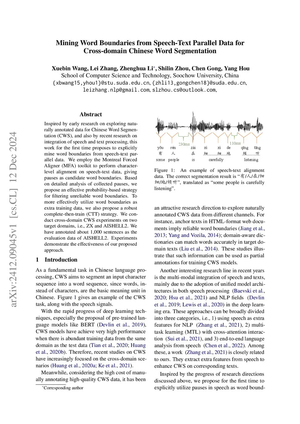 Inspired by early research on exploring naturally annotated data for Chinese Word Segmentation (CWS), and also by recent research on integration of speech and text processing, this work for the first time proposes to explicitly mine word boundaries from speech-text parallel data. We employ the Montreal Forced Aligner (MFA) toolkit to perform character-level alignment on speech-text data, giving pauses as candidate word boundaries. Based on detailed analysis of collected pauses, we propose an effective probability-based strategy for filtering unreliable word boundaries. To more effectively utilize word boundaries as extra training data, we also propose a robust complete-then-train (CTT) strategy. We conduct cross-domain CWS experiments on two target domains, i.e., ZX and AISHELL2. We have annotated about 1,000 sentences as the evaluation data of AISHELL2. Experiments demonstrate the effectiveness of our proposed approach.