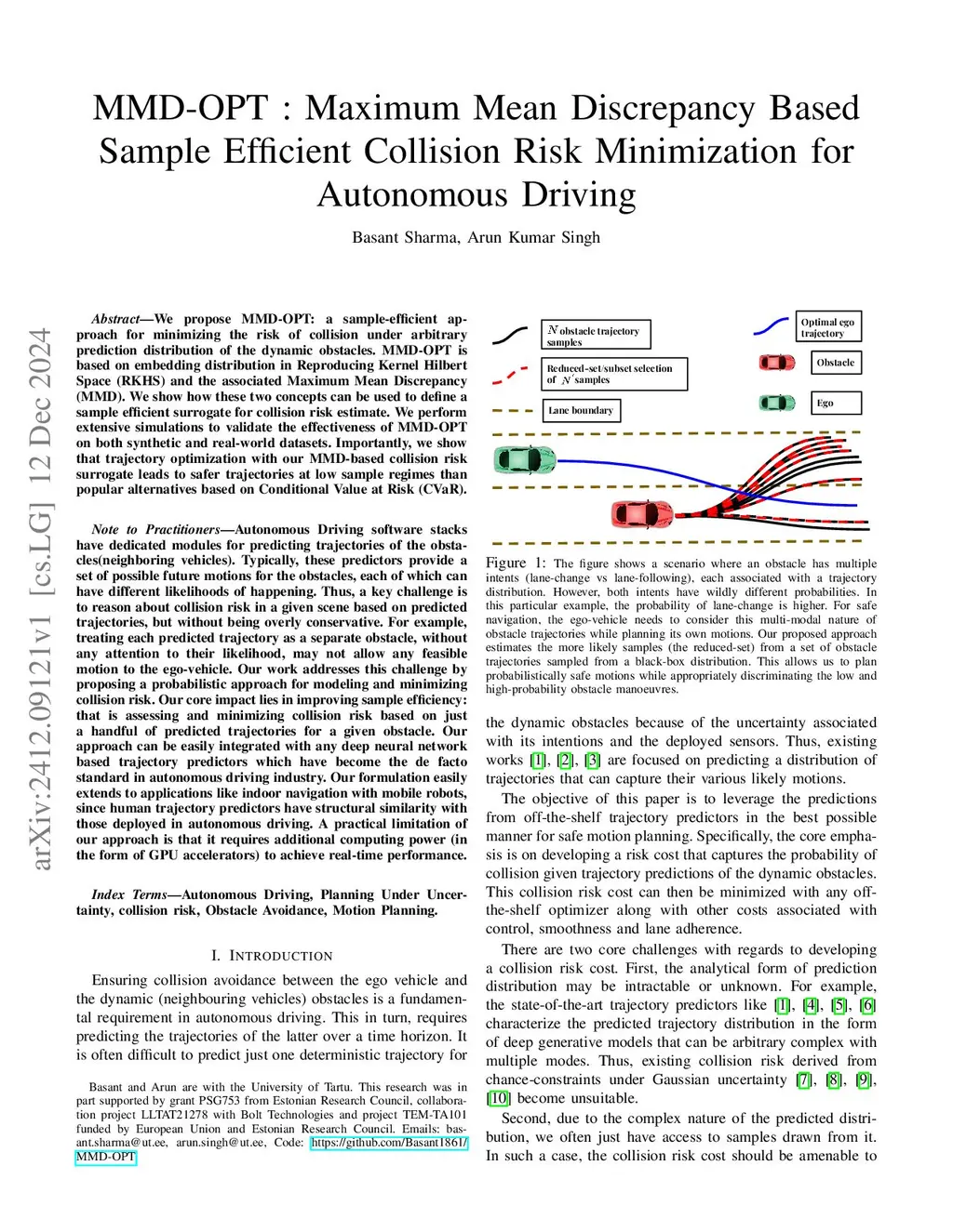 MMD-OPT : Maximum Mean Discrepancy Based Sample Efficient Collision Risk Minimization for Autonomous Driving