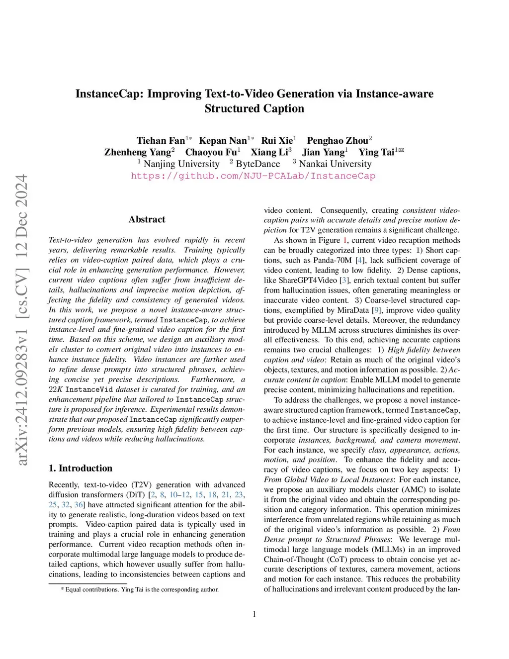 Text-to-video generation has evolved rapidly in recent years, delivering remarkable results. Training typically relies on video-caption paired data, which plays a crucial role in enhancing generation performance. However, current video captions often suffer from insufficient details, hallucinations and imprecise motion depiction, affecting the fidelity and consistency of generated videos. In this work, we propose a novel instance-aware structured caption framework, termed InstanceCap, to achieve instance-level and fine-grained video caption for the first time. Based on this scheme, we design an auxiliary models cluster to convert original video into instances to enhance instance fidelity. Video instances are further used to refine dense prompts into structured phrases, achieving concise yet precise descriptions. Furthermore, a 22K InstanceVid dataset is curated for training, and an enhancement pipeline that tailored to InstanceCap structure is proposed for inference. Experimental results demonstrate that our proposed InstanceCap significantly outperform previous models, ensuring high fidelity between captions and videos while reducing hallucinations.