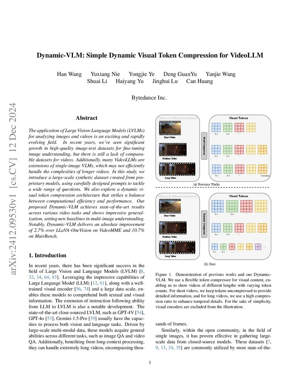 The application of Large Vision-Language Models (LVLMs) for analyzing images and videos is an exciting and rapidly evolving field. In recent years, we've seen significant growth in high-quality image-text datasets for fine-tuning image understanding, but there is still a lack of comparable datasets for videos. Additionally, many VideoLLMs are extensions of single-image VLMs, which may not efficiently handle the complexities of longer videos. In this study, we introduce a large-scale synthetic dataset created from proprietary models, using carefully designed prompts to tackle a wide range of questions. We also explore a dynamic visual token compression architecture that strikes a balance between computational efficiency and performance. Our proposed \model{} achieves state-of-the-art results across various video tasks and shows impressive generalization, setting new baselines in multi-image understanding. Notably, \model{} delivers an absolute improvement of 2.7\% over LLaVA-OneVision on VideoMME and 10.7\% on MuirBench. Codes are available at https://github.com/Hon-Wong/ByteVideoLLM