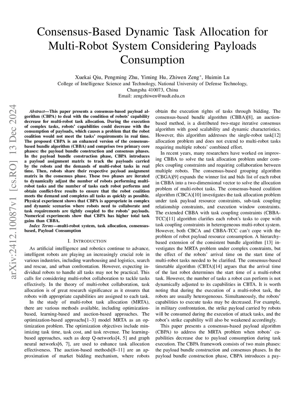 This paper presents a consensus-based payload algorithm (CBPA) to deal with the condition of robots' capability decrease for multi-robot task allocation. During the execution of complex tasks, robots' capabilities could decrease with the consumption of payloads, which causes a problem that the robot coalition would not meet the tasks' requirements in real time. The proposed CBPA is an enhanced version of the consensus-based bundle algorithm (CBBA) and comprises two primary core phases: the payload bundle construction and consensus phases. In the payload bundle construction phase, CBPA introduces a payload assignment matrix to track the payloads carried by the robots and the demands of multi-robot tasks in real time. Then, robots share their respective payload assignment matrix in the consensus phase. These two phases are iterated to dynamically adjust the number of robots performing multi-robot tasks and the number of tasks each robot performs and obtain conflict-free results to ensure that the robot coalition meets the demand and completes all tasks as quickly as possible. Physical experiment shows that CBPA is appropriate in complex and dynamic scenarios where robots need to collaborate and task requirements are tightly coupled to the robots' payloads. Numerical experiments show that CBPA has higher total task gains than CBBA.