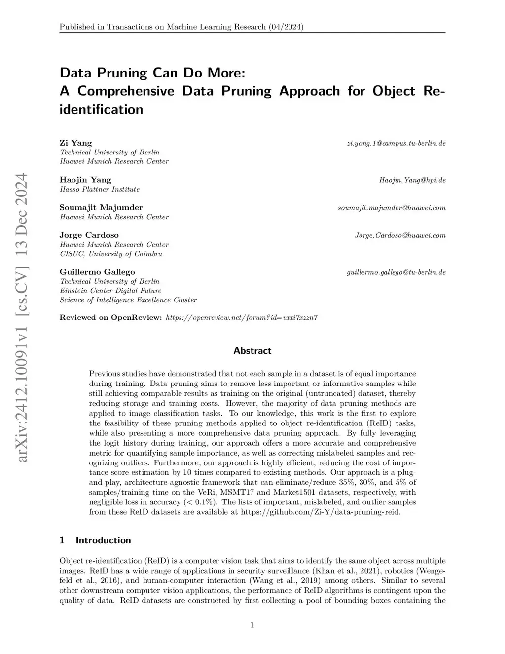 Previous studies have demonstrated that not each sample in a dataset is of equal importance during training. Data pruning aims to remove less important or informative samples while still achieving comparable results as training on the original (untruncated) dataset, thereby reducing storage and training costs. However, the majority of data pruning methods are applied to image classification tasks. To our knowledge, this work is the first to explore the feasibility of these pruning methods applied to object re-identification (ReID) tasks, while also presenting a more comprehensive data pruning approach. By fully leveraging the logit history during training, our approach offers a more accurate and comprehensive metric for quantifying sample importance, as well as correcting mislabeled samples and recognizing outliers. Furthermore, our approach is highly efficient, reducing the cost of importance score estimation by 10 times compared to existing methods. Our approach is a plug-and-play, architecture-agnostic framework that can eliminate/reduce 35%, 30%, and 5% of samples/training time on the VeRi, MSMT17 and Market1501 datasets, respectively, with negligible loss in accuracy (< 0.1%). The lists of important, mislabeled, and outlier samples from these ReID datasets are available at https://github.com/Zi-Y/data-pruning-reid.