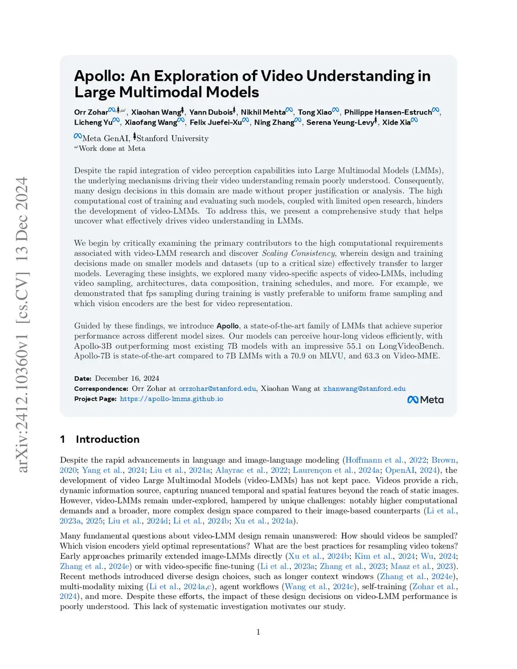 Despite the rapid integration of video perception capabilities into Large Multimodal Models (LMMs), the underlying mechanisms driving their video understanding remain poorly understood. Consequently, many design decisions in this domain are made without proper justification or analysis. The high computational cost of training and evaluating such models, coupled with limited open research, hinders the development of video-LMMs. To address this, we present a comprehensive study that helps uncover what effectively drives video understanding in LMMs. We begin by critically examining the primary contributors to the high computational requirements associated with video-LMM research and discover Scaling Consistency, wherein design and training decisions made on smaller models and datasets (up to a critical size) effectively transfer to larger models. Leveraging these insights, we explored many video-specific aspects of video-LMMs, including video sampling, architectures, data composition, training schedules, and more. For example, we demonstrated that fps sampling during training is vastly preferable to uniform frame sampling and which vision encoders are the best for video representation. Guided by these findings, we introduce Apollo, a state-of-the-art family of LMMs that achieve superior performance across different model sizes. Our models can perceive hour-long videos efficiently, with Apollo-3B outperforming most existing B models with an impressive 55.1 on LongVideoBench. Apollo-7B is state-of-the-art compared to 7B LMMs with a 70.9 on MLVU, and 63.3 on Video-MME.