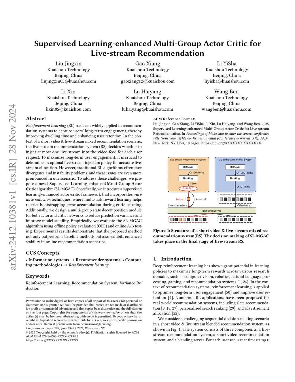 Supervised Learning-enhanced Multi-Group Actor Critic for Live Stream Allocation in Feed