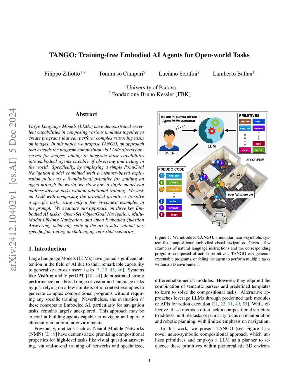 Large Language Models (LLMs) have demonstrated excellent capabilities in composing various modules together to create programs that can perform complex reasoning tasks on images. In this paper, we propose TANGO, an approach that extends the program composition via LLMs already observed for images, aiming to integrate those capabilities into embodied agents capable of observing and acting in the world. Specifically, by employing a simple PointGoal Navigation model combined with a memory-based exploration policy as a foundational primitive for guiding an agent through the world, we show how a single model can address diverse tasks without additional training. We task an LLM with composing the provided primitives to solve a specific task, using only a few in-context examples in the prompt. We evaluate our approach on three key Embodied AI tasks: Open-Set ObjectGoal Navigation, Multi-Modal Lifelong Navigation, and Open Embodied Question Answering, achieving state-of-the-art results without any specific fine-tuning in challenging zero-shot scenarios.