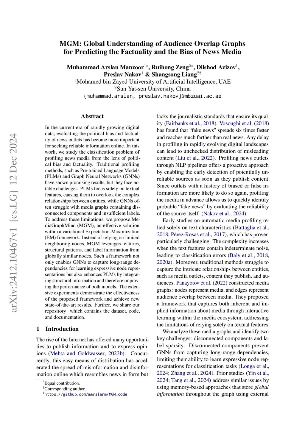 In the current era of rapidly growing digital data, evaluating the political bias and factuality of news outlets has become more important for seeking reliable information online. In this work, we study the classification problem of profiling news media from the lens of political bias and factuality. Traditional profiling methods, such as Pre-trained Language Models (PLMs) and Graph Neural Networks (GNNs) have shown promising results, but they face notable challenges. PLMs focus solely on textual features, causing them to overlook the complex relationships between entities, while GNNs often struggle with media graphs containing disconnected components and insufficient labels. To address these limitations, we propose MediaGraphMind (MGM), an effective solution within a variational Expectation-Maximization (EM) framework. Instead of relying on limited neighboring nodes, MGM leverages features, structural patterns, and label information from globally similar nodes. Such a framework not only enables GNNs to capture long-range dependencies for learning expressive node representations but also enhances PLMs by integrating structural information and therefore improving the performance of both models. The extensive experiments demonstrate the effectiveness of the proposed framework and achieve new state-of-the-art results. Further, we share our repository1 which contains the dataset, code, and documentation