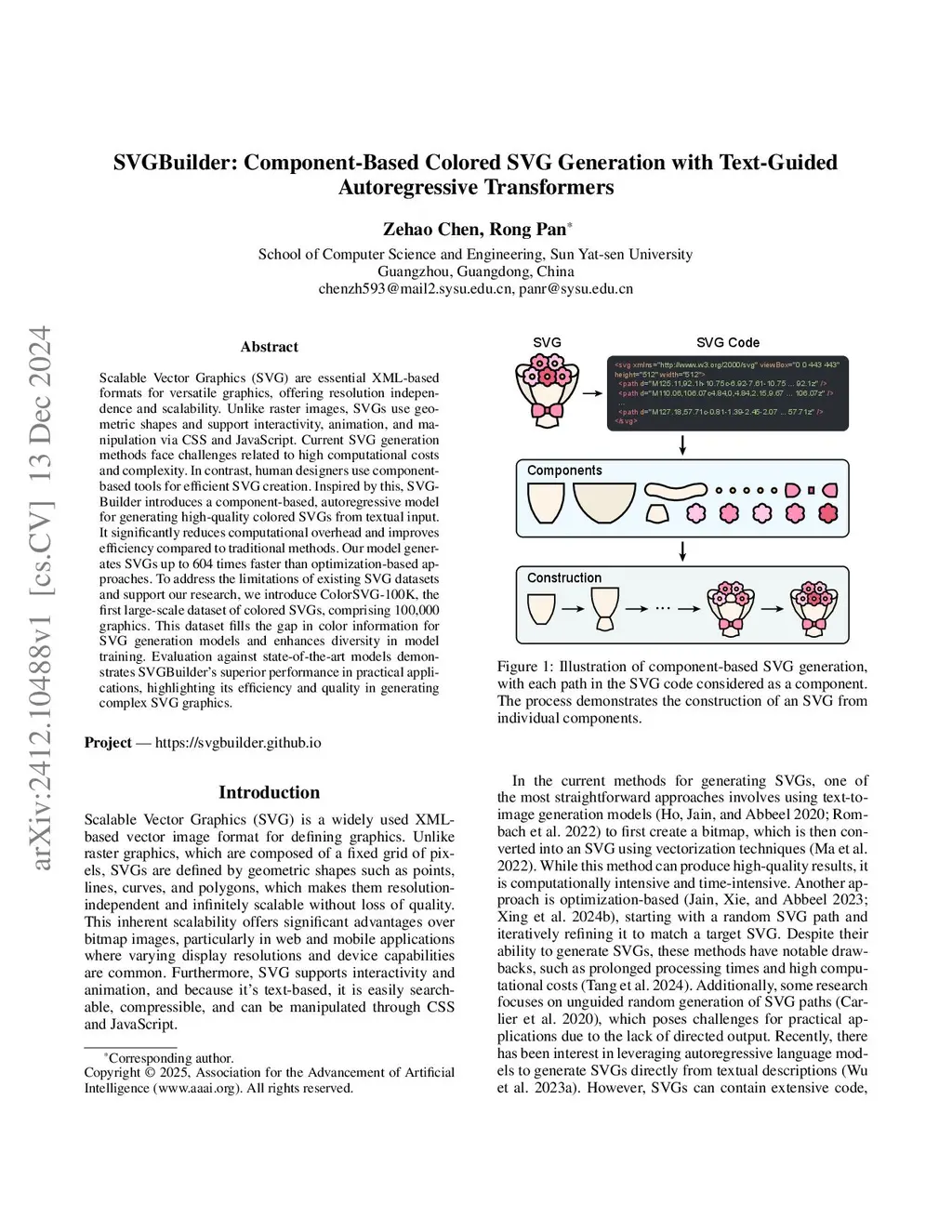 Scalable Vector Graphics (SVG) are essential XML-based formats for versatile graphics, offering resolution independence and scalability. Unlike raster images, SVGs use geometric shapes and support interactivity, animation, and manipulation via CSS and JavaScript. Current SVG generation methods face challenges related to high computational costs and complexity. In contrast, human designers use component-based tools for efficient SVG creation. Inspired by this, SVGBuilder introduces a component-based, autoregressive model for generating high-quality colored SVGs from textual input. It significantly reduces computational overhead and improves efficiency compared to traditional methods. Our model generates SVGs up to 604 times faster than optimization-based approaches. To address the limitations of existing SVG datasets and support our research, we introduce ColorSVG-100K, the first large-scale dataset of colored SVGs, comprising 100,000 graphics. This dataset fills the gap in color information for SVG generation models and enhances diversity in model training. Evaluation against state-of-the-art models demonstrates SVGBuilder's superior performance in practical applications, highlighting its efficiency and quality in generating complex SVG graphics.