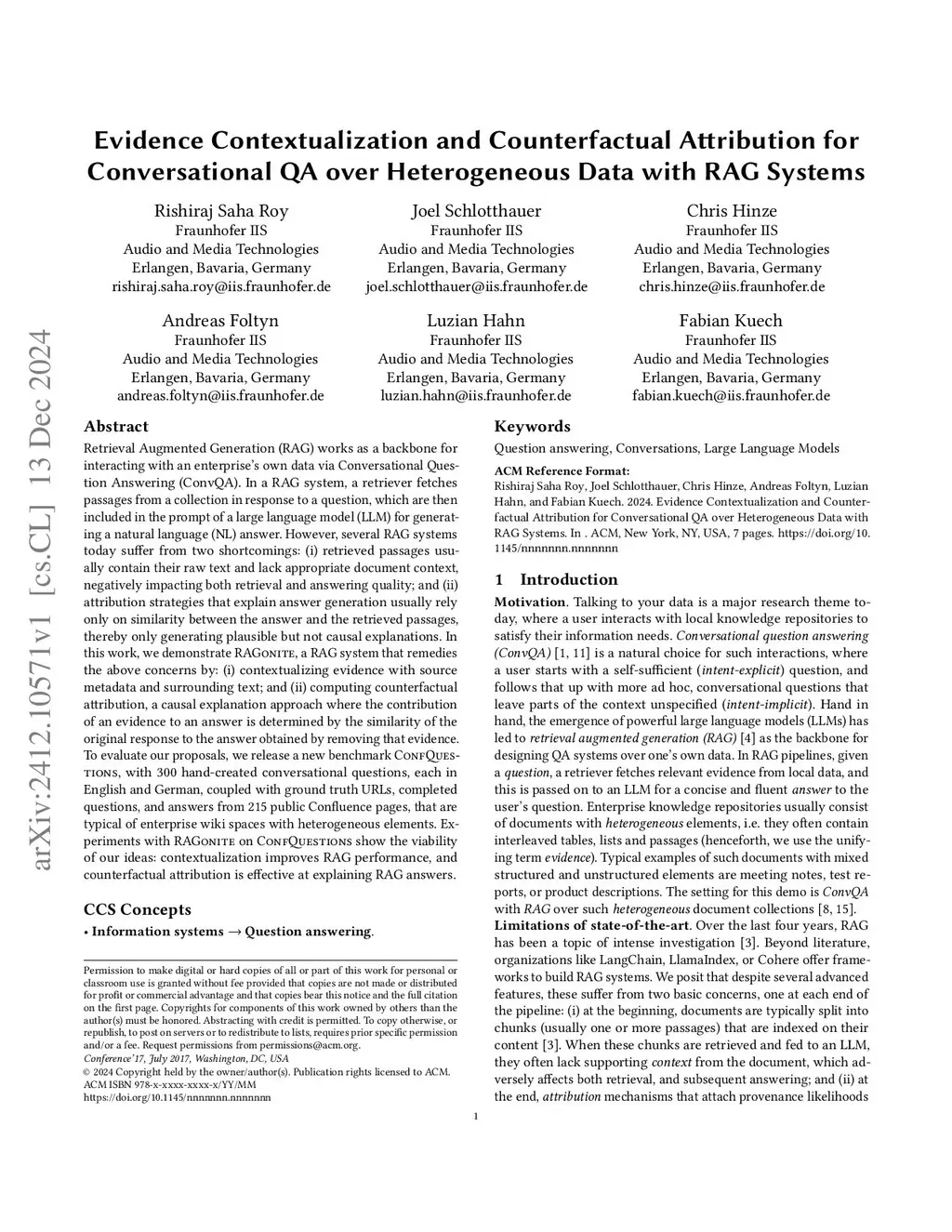 Retrieval Augmented Generation (RAG) works as a backbone for interacting with an enterprise's own data via Conversational Question Answering (ConvQA). In a RAG system, a retriever fetches passages from a collection in response to a question, which are then included in the prompt of a large language model (LLM) for generating a natural language (NL) answer. However, several RAG systems today suffer from two shortcomings: (i) retrieved passages usually contain their raw text and lack appropriate document context, negatively impacting both retrieval and answering quality; and (ii) attribution strategies that explain answer generation usually rely only on similarity between the answer and the retrieved passages, thereby only generating plausible but not causal explanations. In this work, we demonstrate RAGONITE, a RAG system that remedies the above concerns by: (i) contextualizing evidence with source metadata and surrounding text; and (ii) computing counterfactual attribution, a causal explanation approach where the contribution of an evidence to an answer is determined by the similarity of the original response to the answer obtained by removing that evidence. To evaluate our proposals, we release a new benchmark ConfQuestions, with 300 hand-created conversational questions, each in English and German, coupled with ground truth URLs, completed questions, and answers from 215 public Confluence pages, that are typical of enterprise wiki spaces with heterogeneous elements. Experiments with RAGONITE on ConfQuestions show the viability of our ideas: contextualization improves RAG performance, and counterfactual attribution is effective at explaining RAG answers.