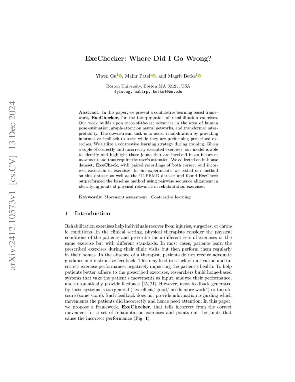 In this paper, we present a contrastive learning based framework, ExeChecker, for the interpretation of rehabilitation exercises. Our work builds upon state-of-the-art advances in the area of human pose estimation, graph-attention neural networks, and transformer interpretablity. The downstream task is to assist rehabilitation by providing informative feedback to users while they are performing prescribed exercises. We utilize a contrastive learning strategy during training. Given a tuple of correctly and incorrectly executed exercises, our model is able to identify and highlight those joints that are involved in an incorrect movement and thus require the user's attention. We collected an in-house dataset, ExeCheck, with paired recordings of both correct and incorrect execution of exercises. In our experiments, we tested our method on this dataset as well as the UI-PRMD dataset and found ExeCheck outperformed the baseline method using pairwise sequence alignment in identifying joints of physical relevance in rehabilitation exercises.