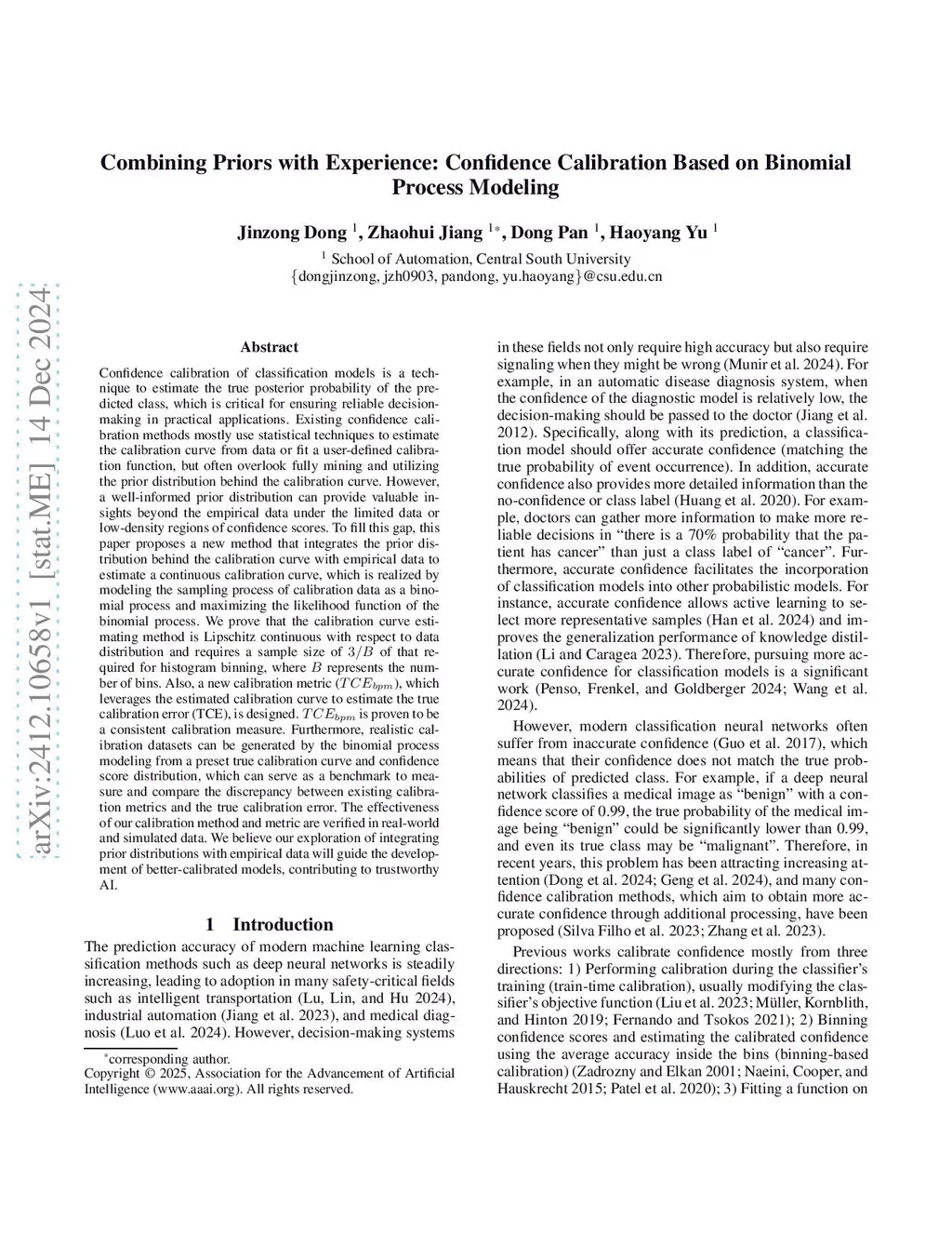 Confidence calibration of classification models is a technique to estimate the true posterior probability of the predicted class, which is critical for ensuring reliable decision-making in practical applications. Existing confidence calibration methods mostly use statistical techniques to estimate the calibration curve from data or fit a user-defined calibration function, but often overlook fully mining and utilizing the prior distribution behind the calibration curve. However, a well-informed prior distribution can provide valuable insights beyond the empirical data under the limited data or low-density regions of confidence scores. To fill this gap, this paper proposes a new method that integrates the prior distribution behind the calibration curve with empirical data to estimate a continuous calibration curve, which is realized by modeling the sampling process of calibration data as a binomial process and maximizing the likelihood function of the binomial process. We prove that the calibration curve estimating method is Lipschitz continuous with respect to data distribution and requires a sample size of of that required for histogram binning, where represents the number of bins. Also, a new calibration metric (), which leverages the estimated calibration curve to estimate the true calibration error (TCE), is designed. is proven to be a consistent calibration measure. Furthermore, realistic calibration datasets can be generated by the binomial process modeling from a preset true calibration curve and confidence score distribution, which can serve as a benchmark to measure and compare the discrepancy between existing calibration metrics and the true calibration error. The effectiveness of our calibration method and metric are verified in real-world and simulated data.